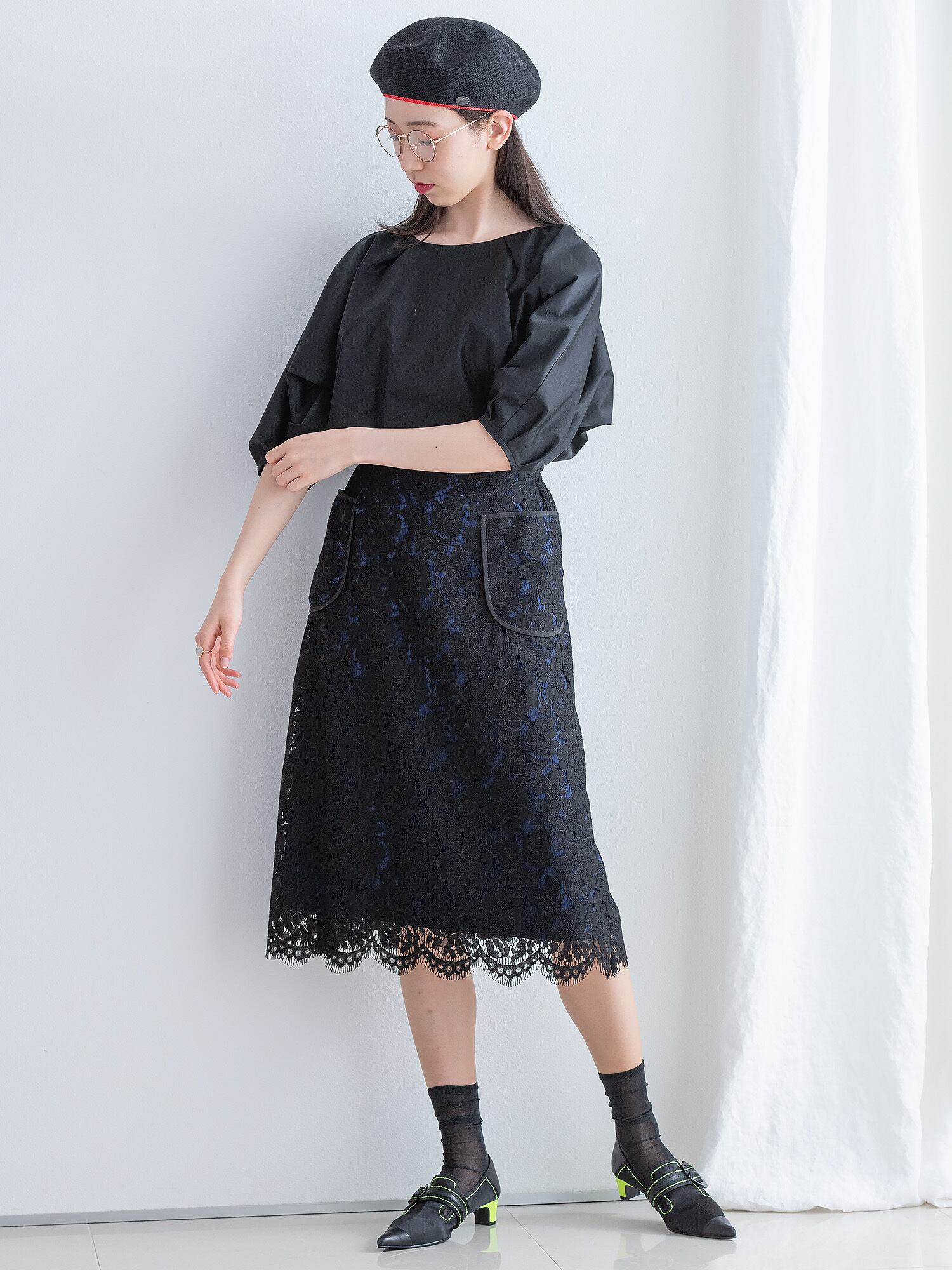 肩から袖にかけてのフワッと感がパフスリーブの大人版としての優しい印象を醸し出してます。袖丈は手首が細く見える八分丈。伸縮性のあるストレッチ素材なので、プルオーバーの様に、被っての着用が出来ます。