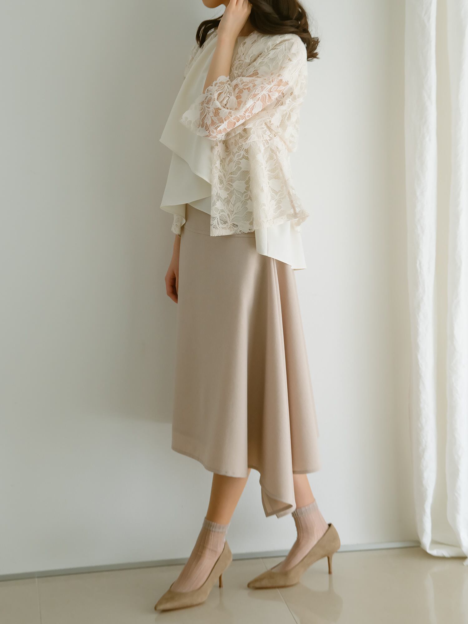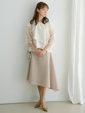 アンバランスに取ったフレアーシルエットが歩く度に揺れ動く、フレアースカートです。ウエスト部分は幅の広いヨーク切り替えで、そこから控えめなフレアーが広がります。左サイドにたっぷりと取ったフレアーが動くごとに美しいシルエットを描きます。裾のハンカチーフカットは膝から下の足を華奢に女性らしさを強調します。