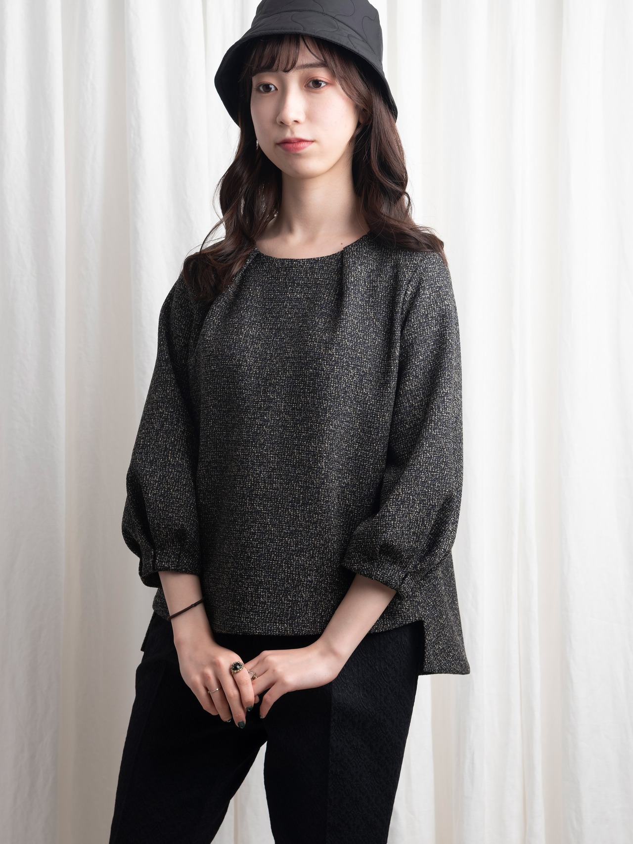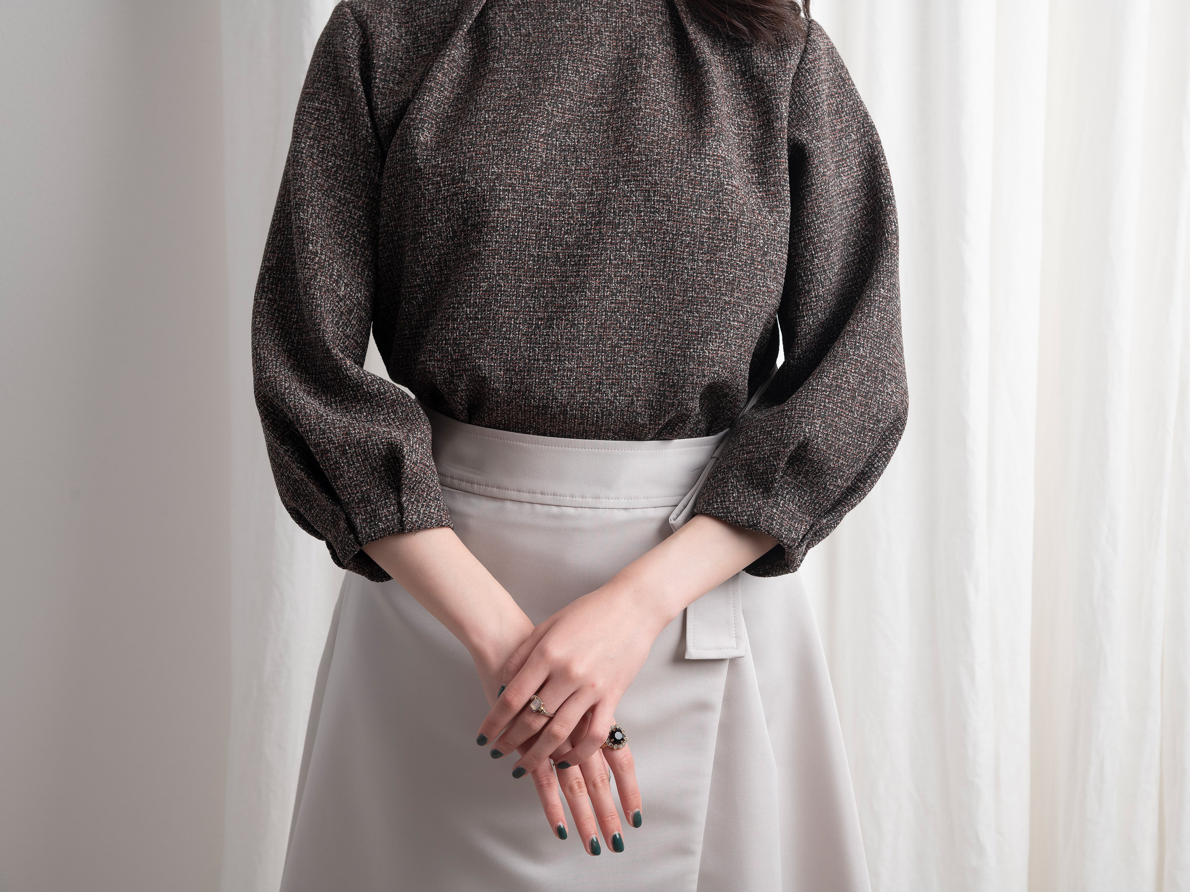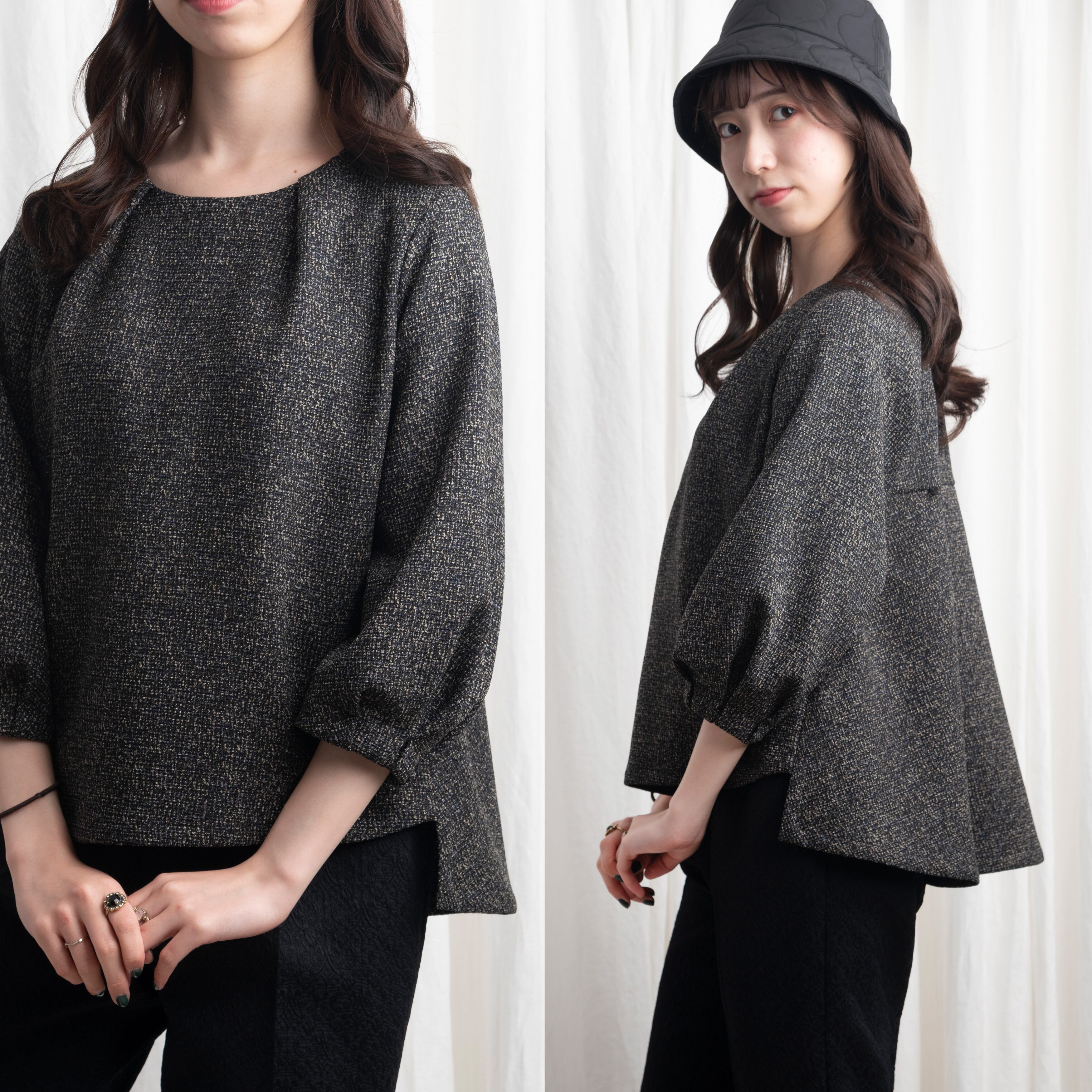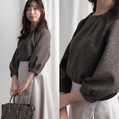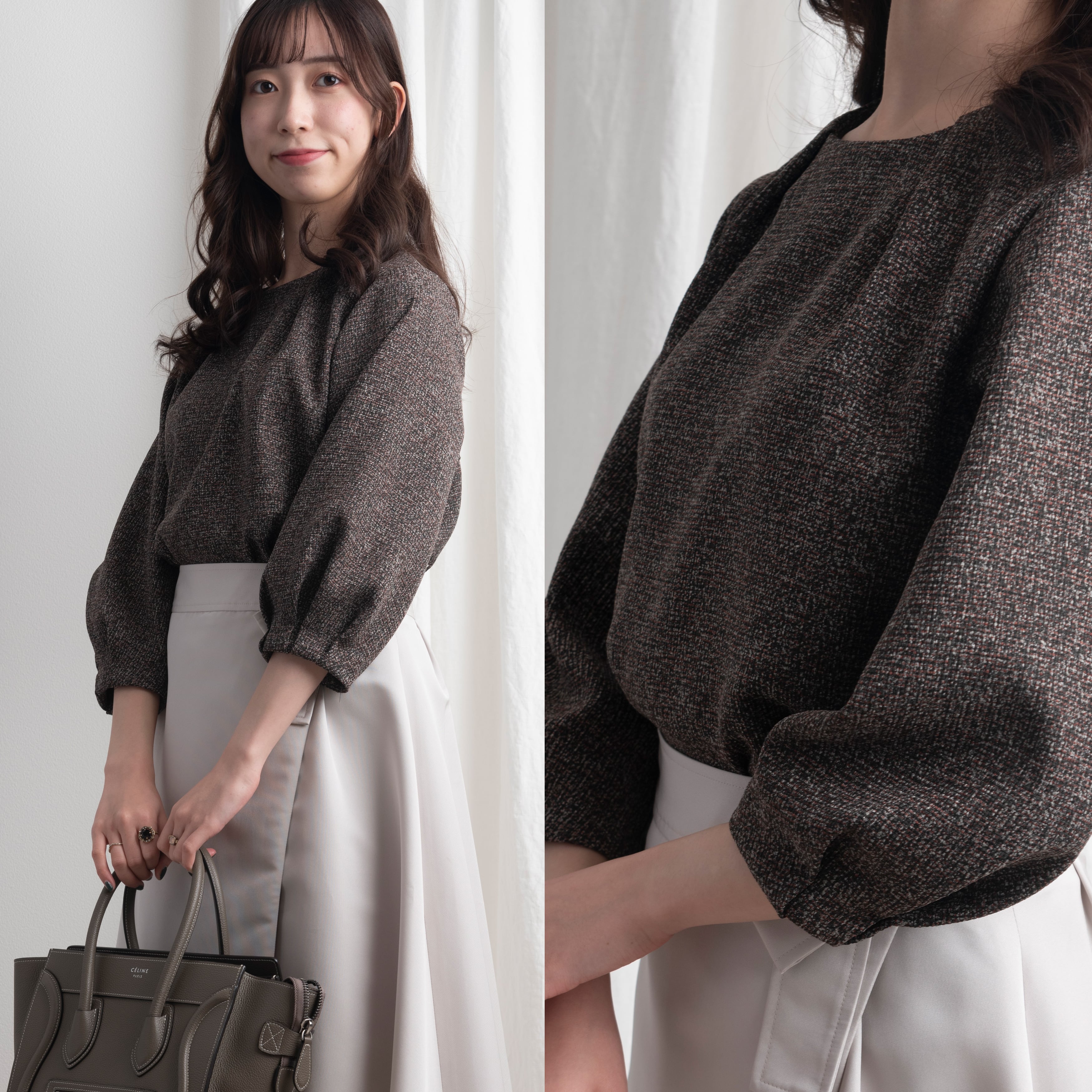 八分袖の袖口にタックを寄せてふっくらとさせました。ノーカラーの方から袖口にかけてのふんわりとしたシルエットは、パフスリーブでありながら、大人感を演出します。オーバーブラウス、ボトムインのどちらのスタイルもきまります。