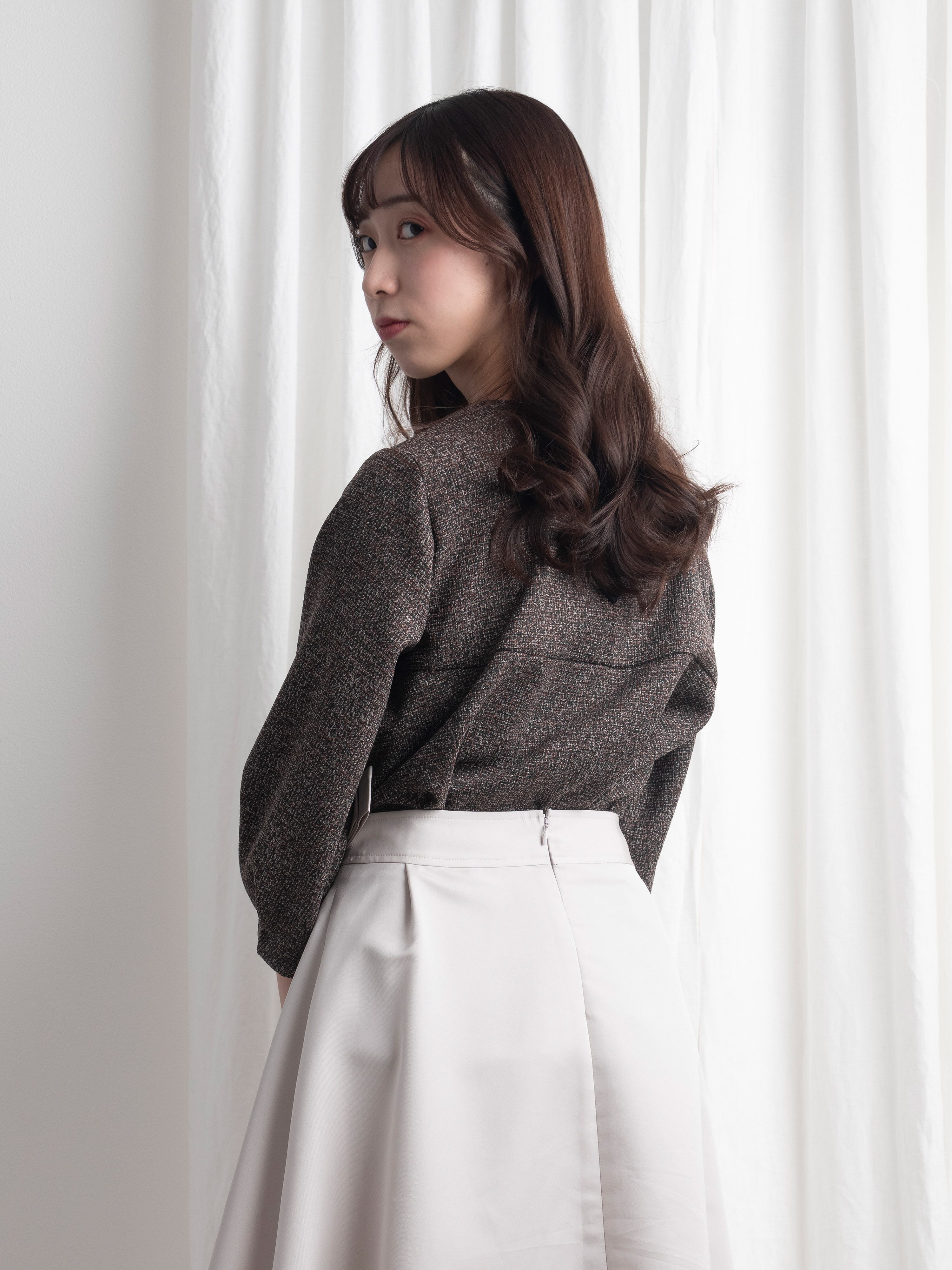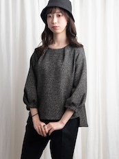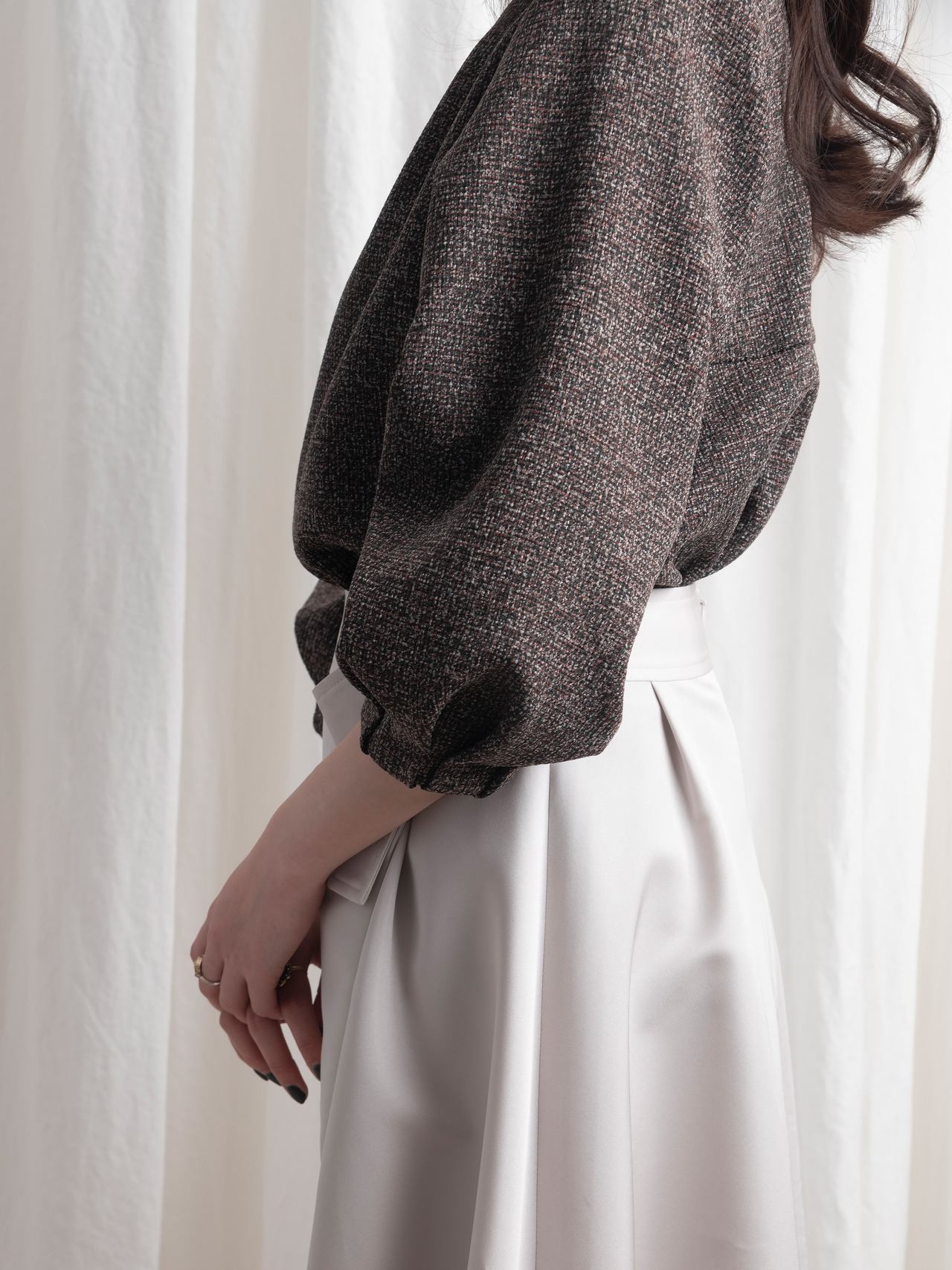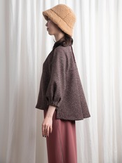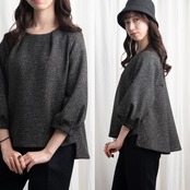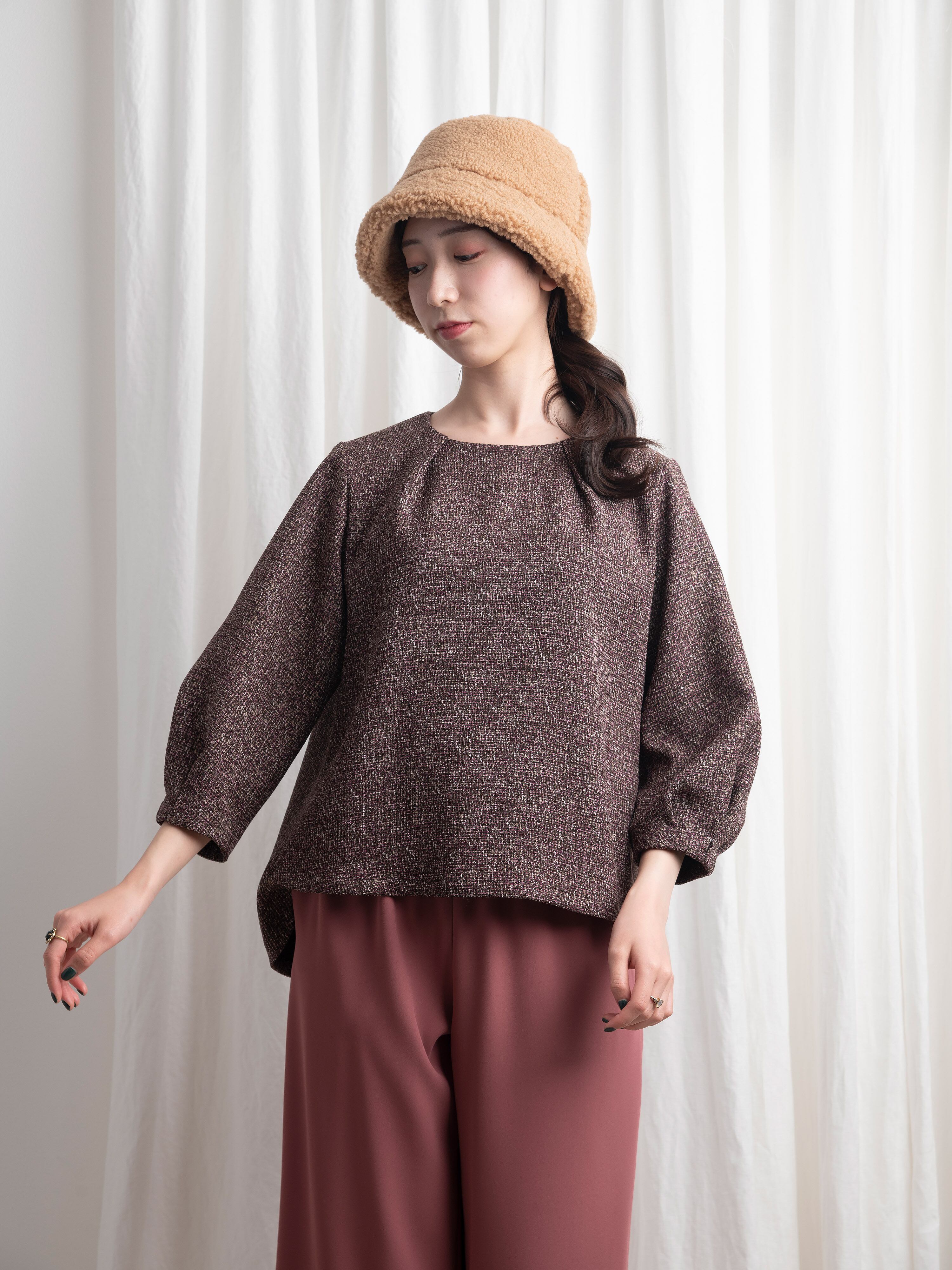 八分袖の袖口にタックを寄せてふっくらとさせました。ノーカラーの方から袖口にかけてのふんわりとしたシルエットは、パフスリーブでありながら、大人感を演出します。オーバーブラウス、ボトムインのどちらのスタイルもきまります。
