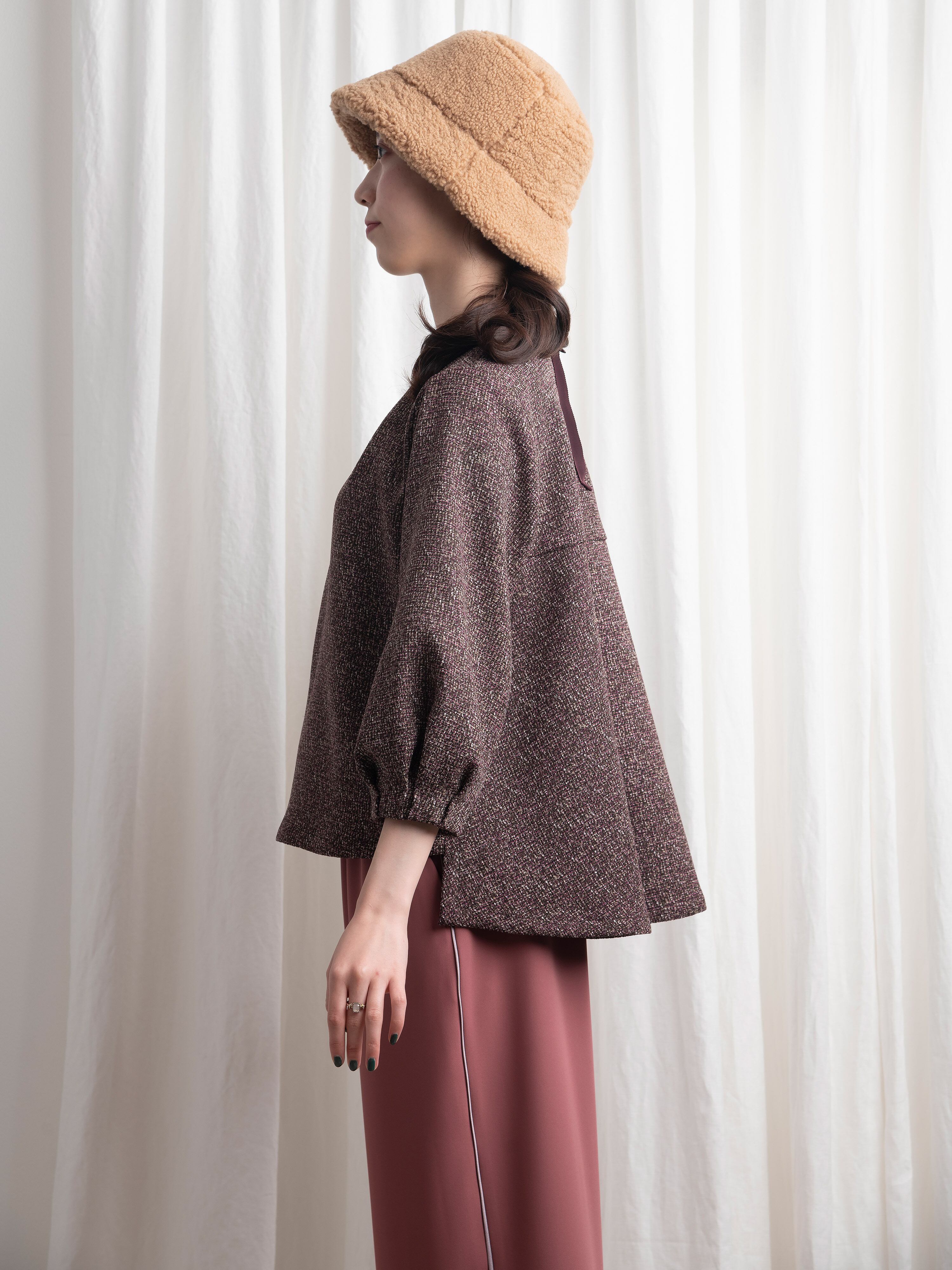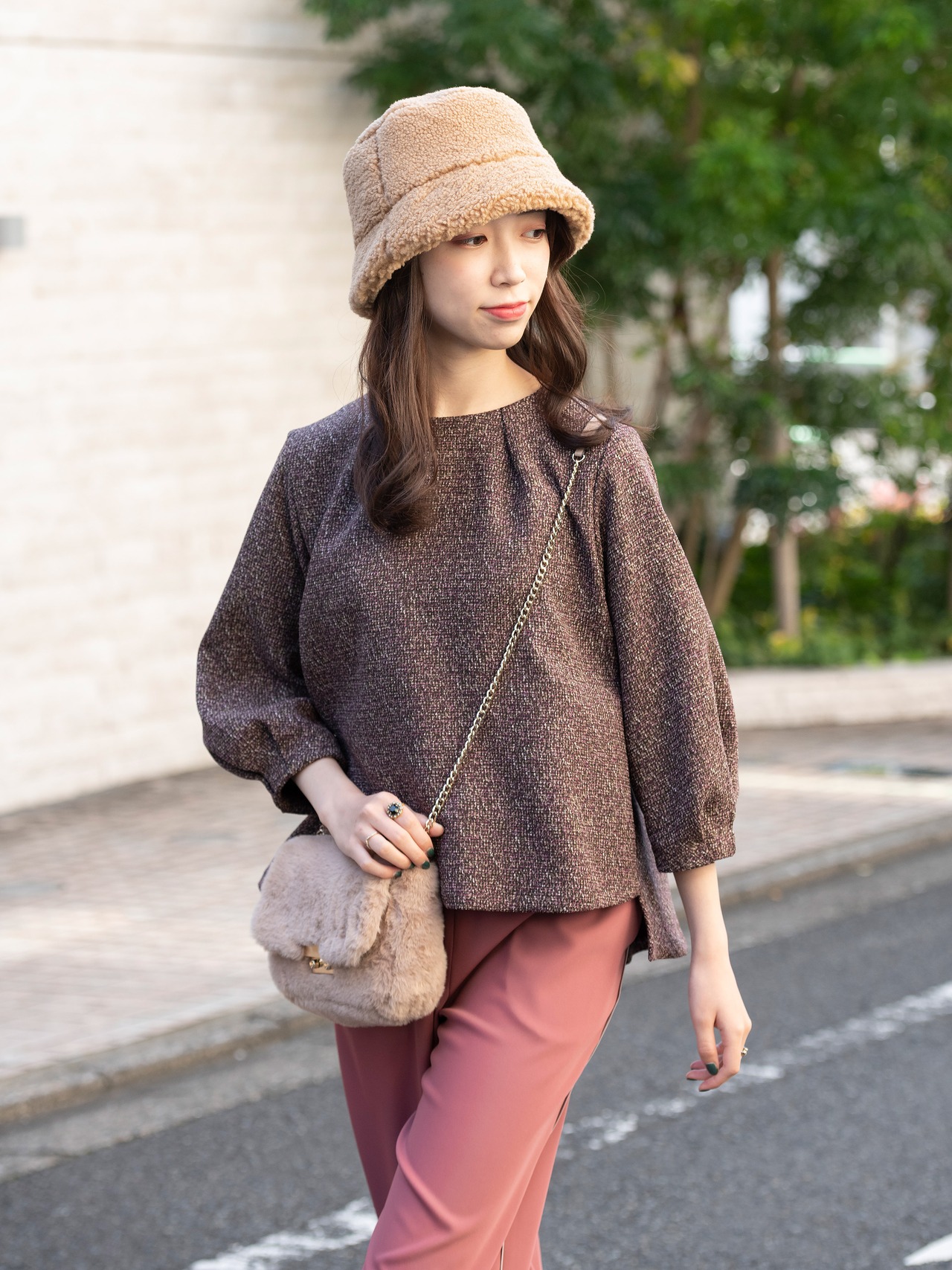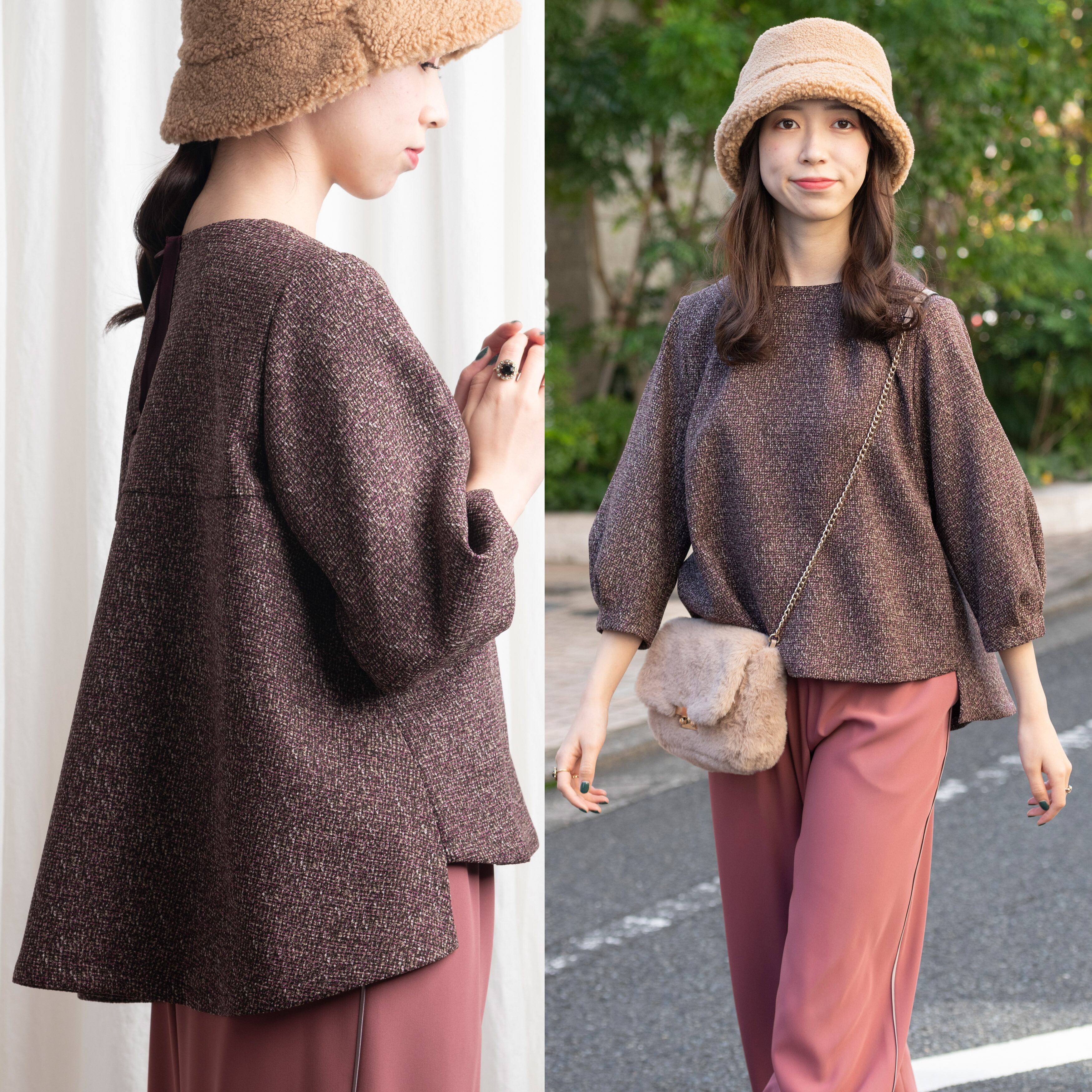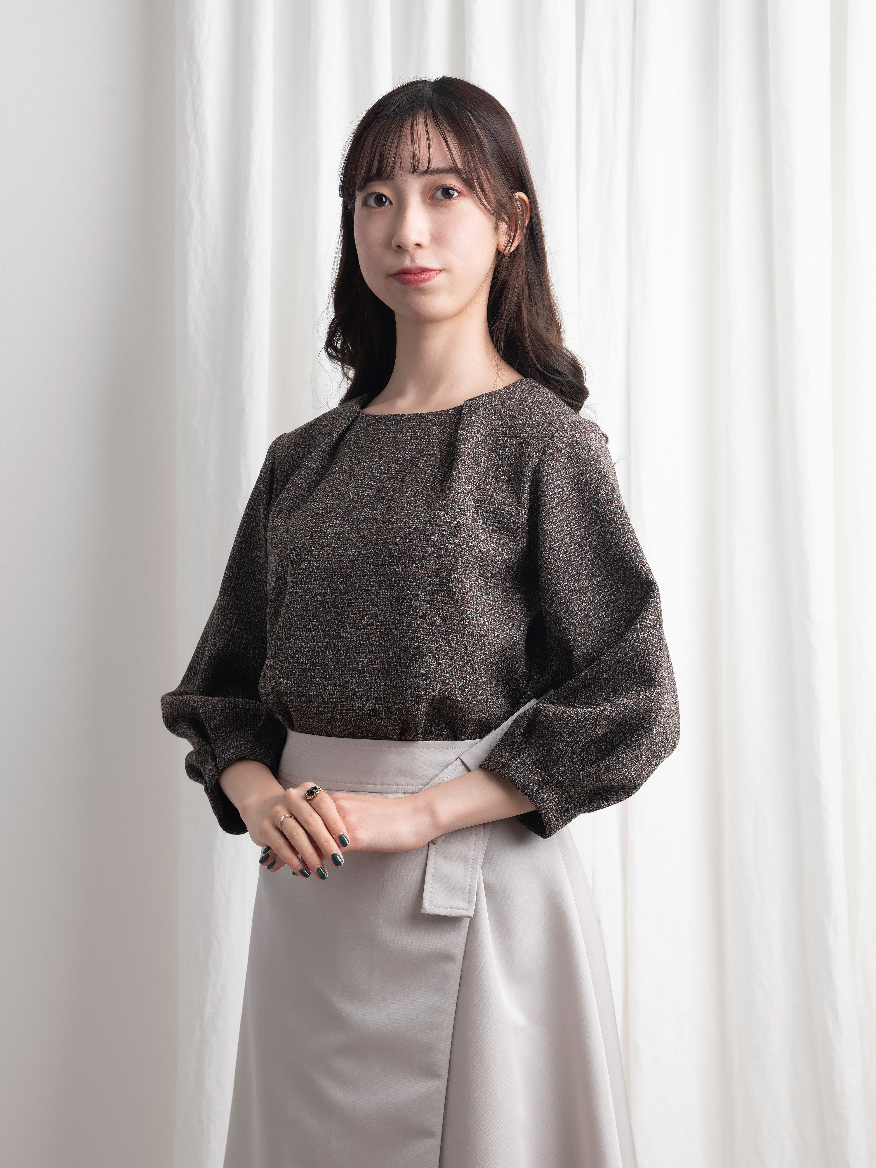 八分袖の袖口にタックを寄せてふっくらとさせました。ノーカラーの方から袖口にかけてのふんわりとしたシルエットは、パフスリーブでありながら、大人感を演出します。オーバーブラウス、ボトムインのどちらのスタイルもきまります。