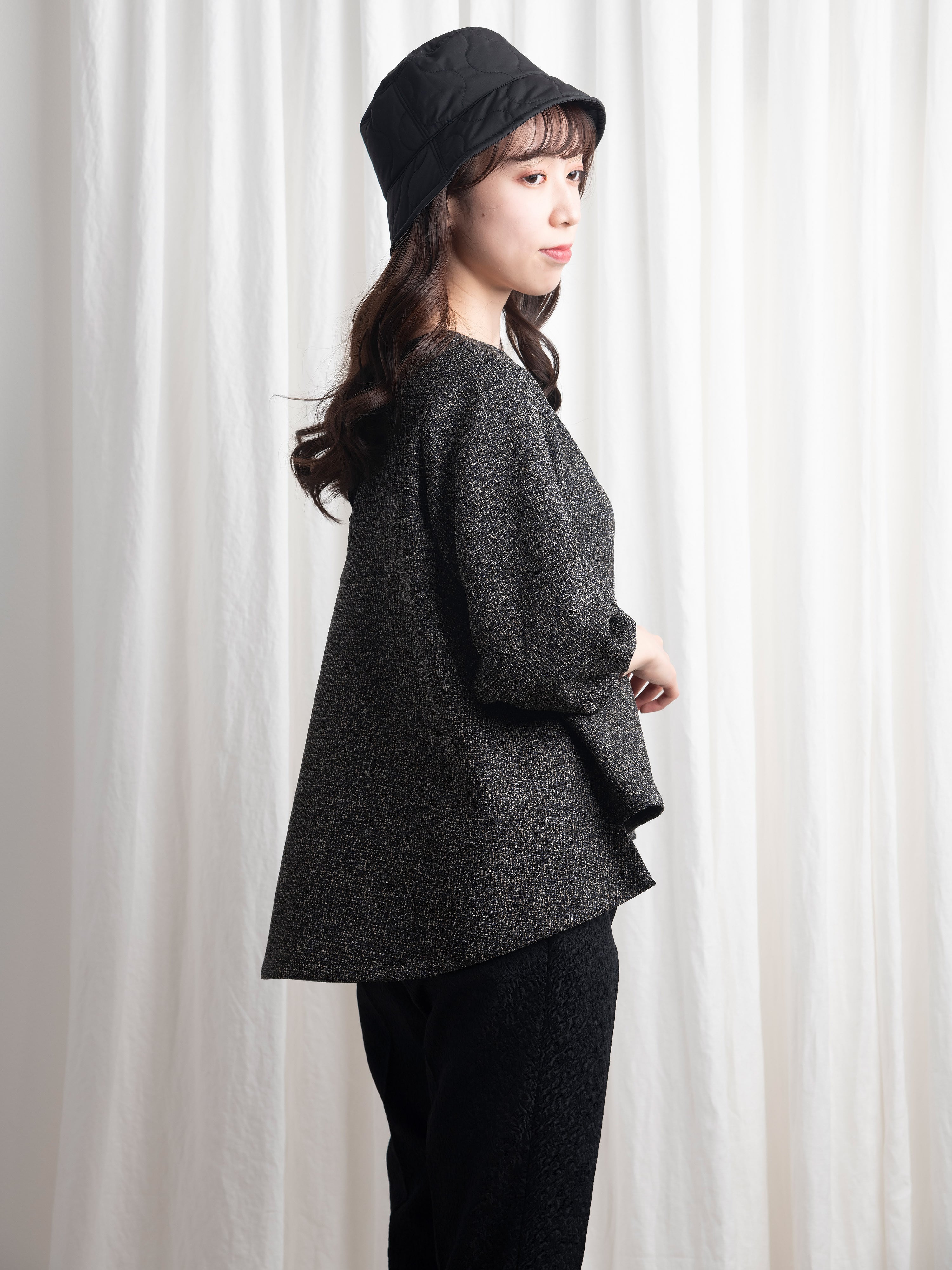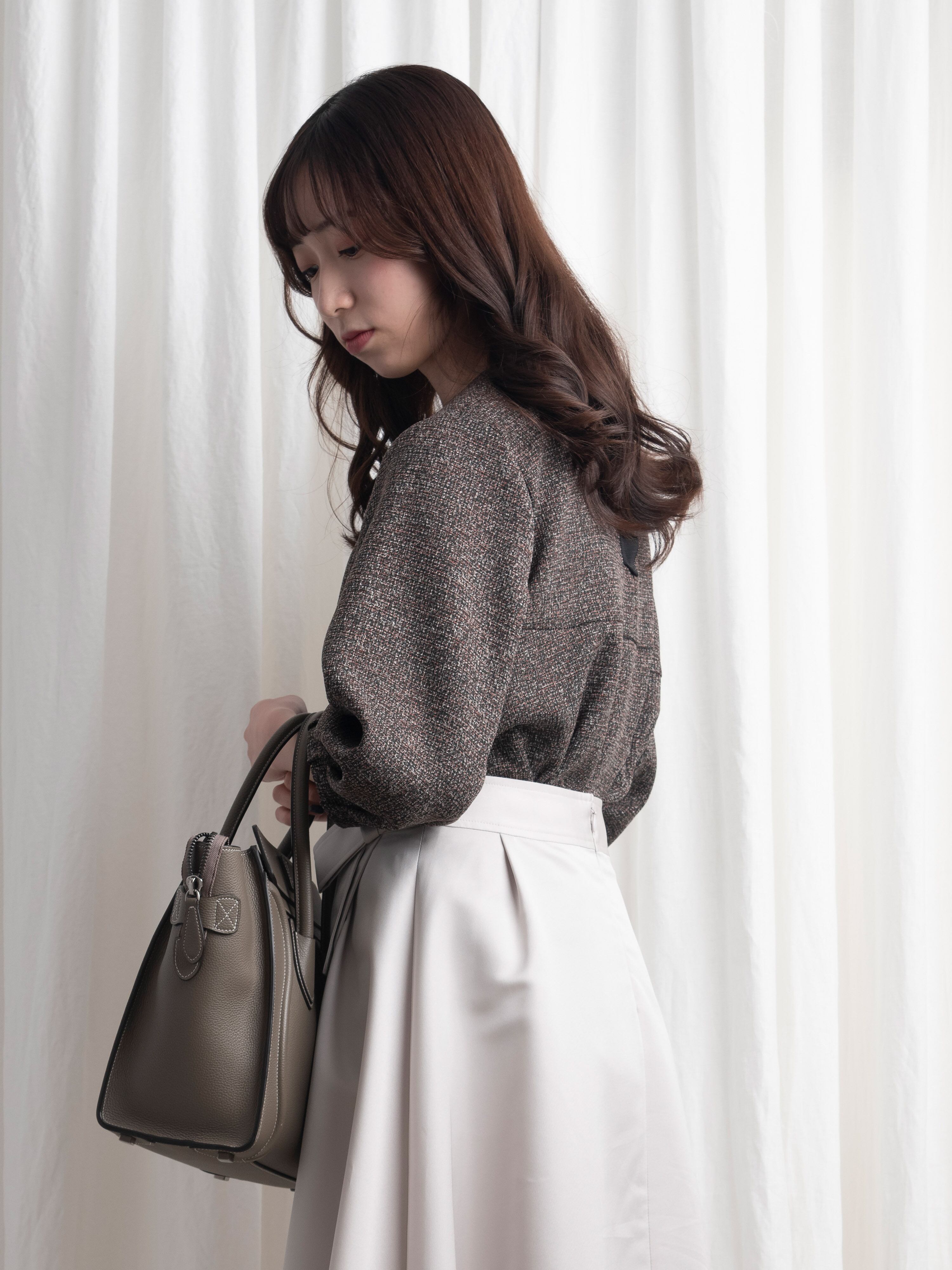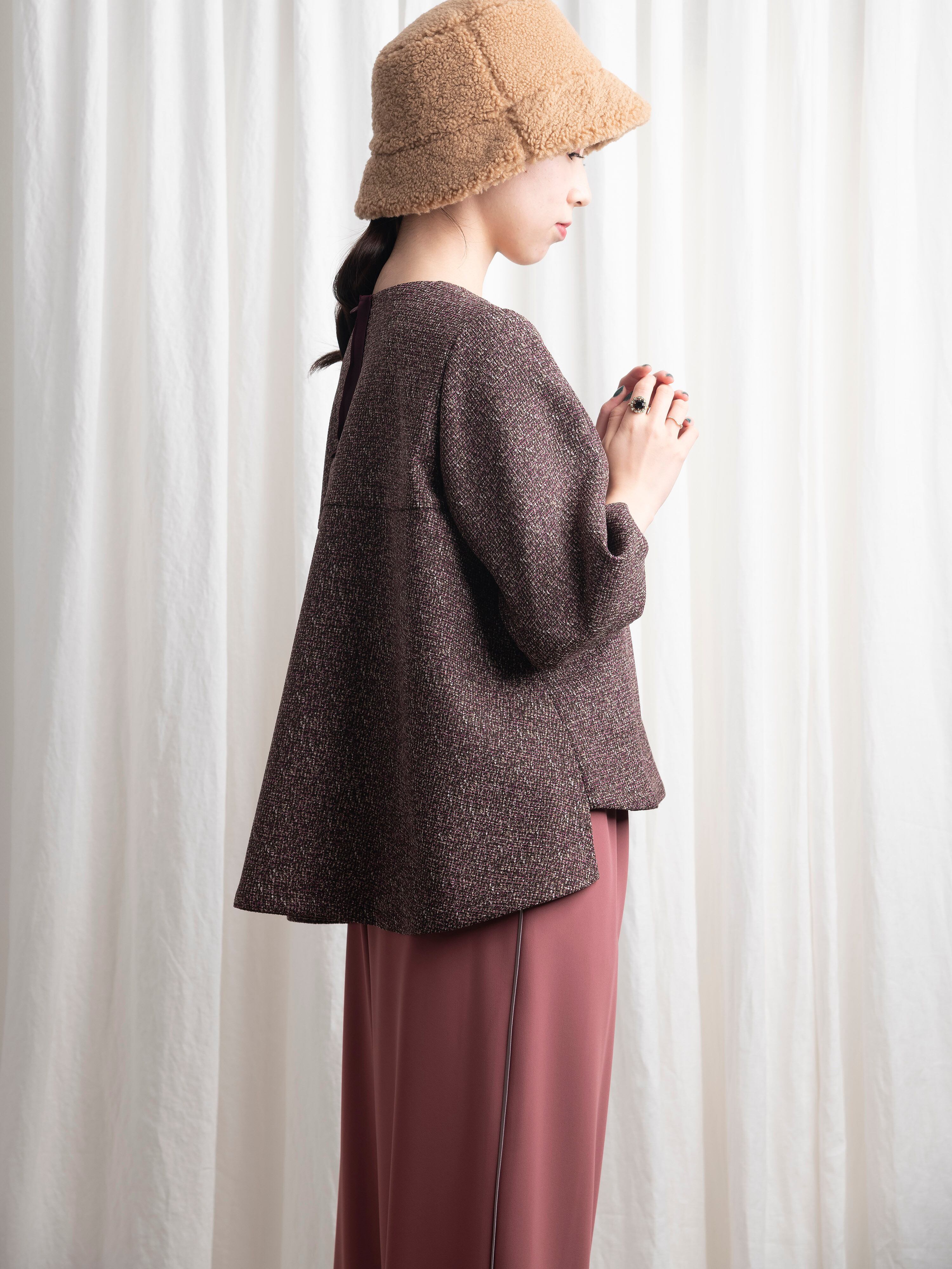 クラシックな表面感のある素材に、ツイード柄をプリントしたブッチャーという珍しい素材を使用。しっかりと質感のある素材で、ブラウスのようなニットのような……そんな印象を与える、存在感あるアイテムです。