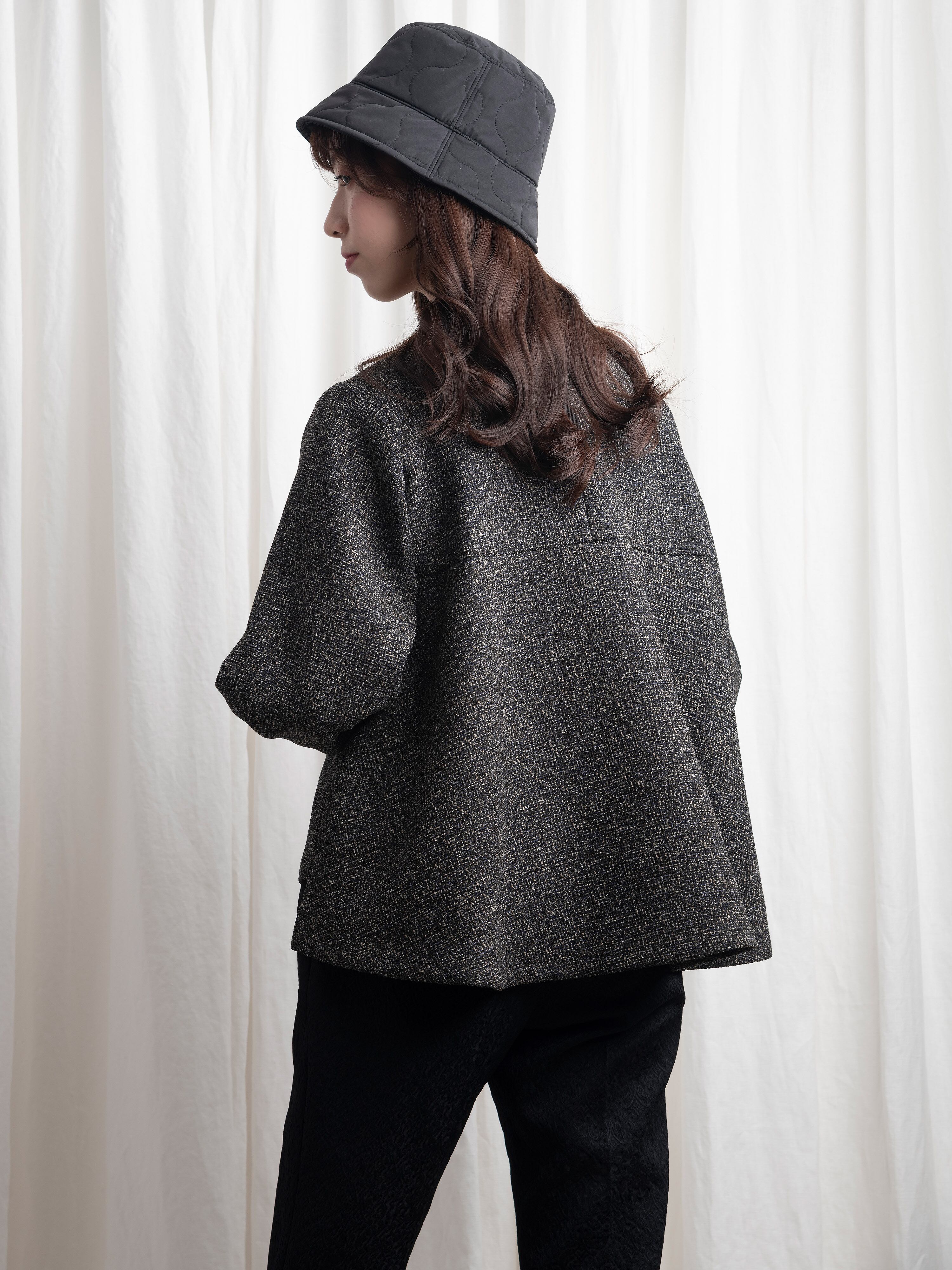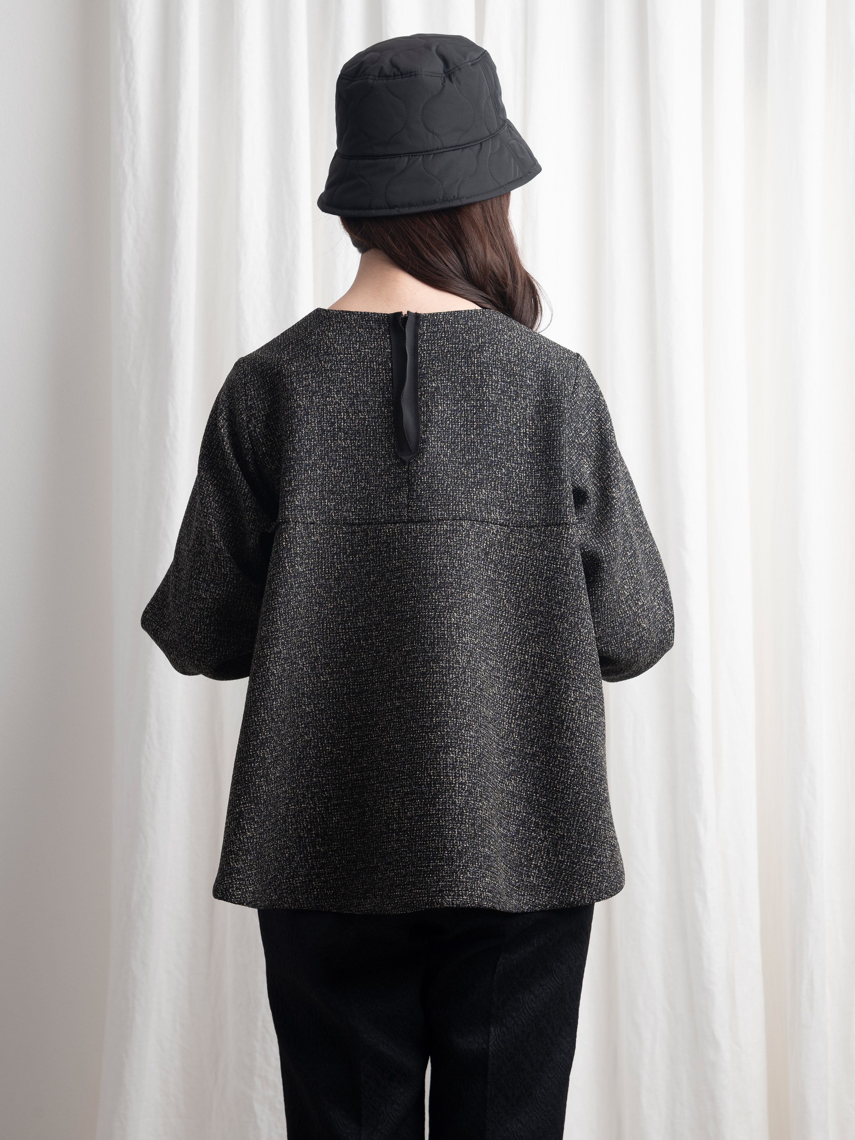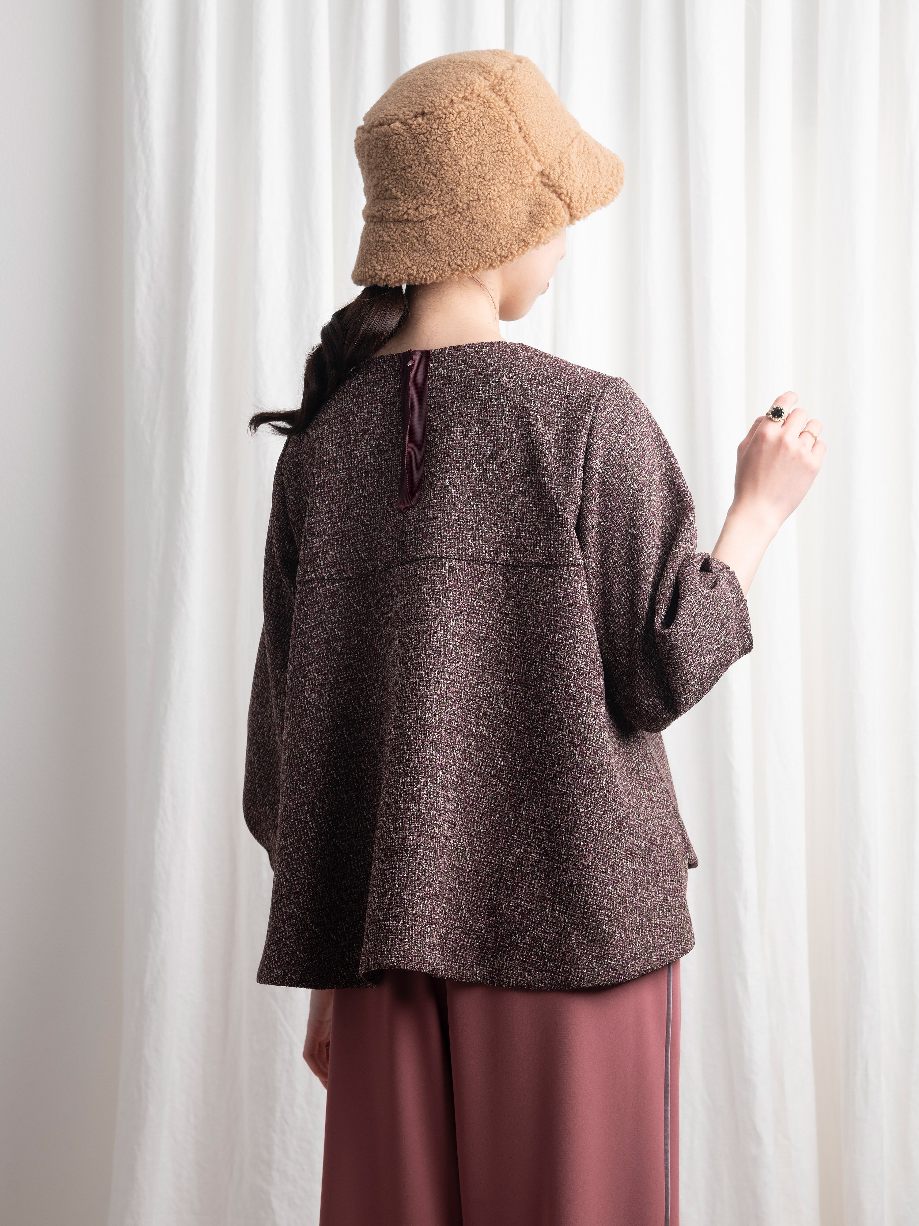 クラシックな表面感のある素材に、ツイード柄をプリントしたブッチャーという珍しい素材を使用。しっかりと質感のある素材で、ブラウスのようなニットのような……そんな印象を与える、存在感あるアイテムです。