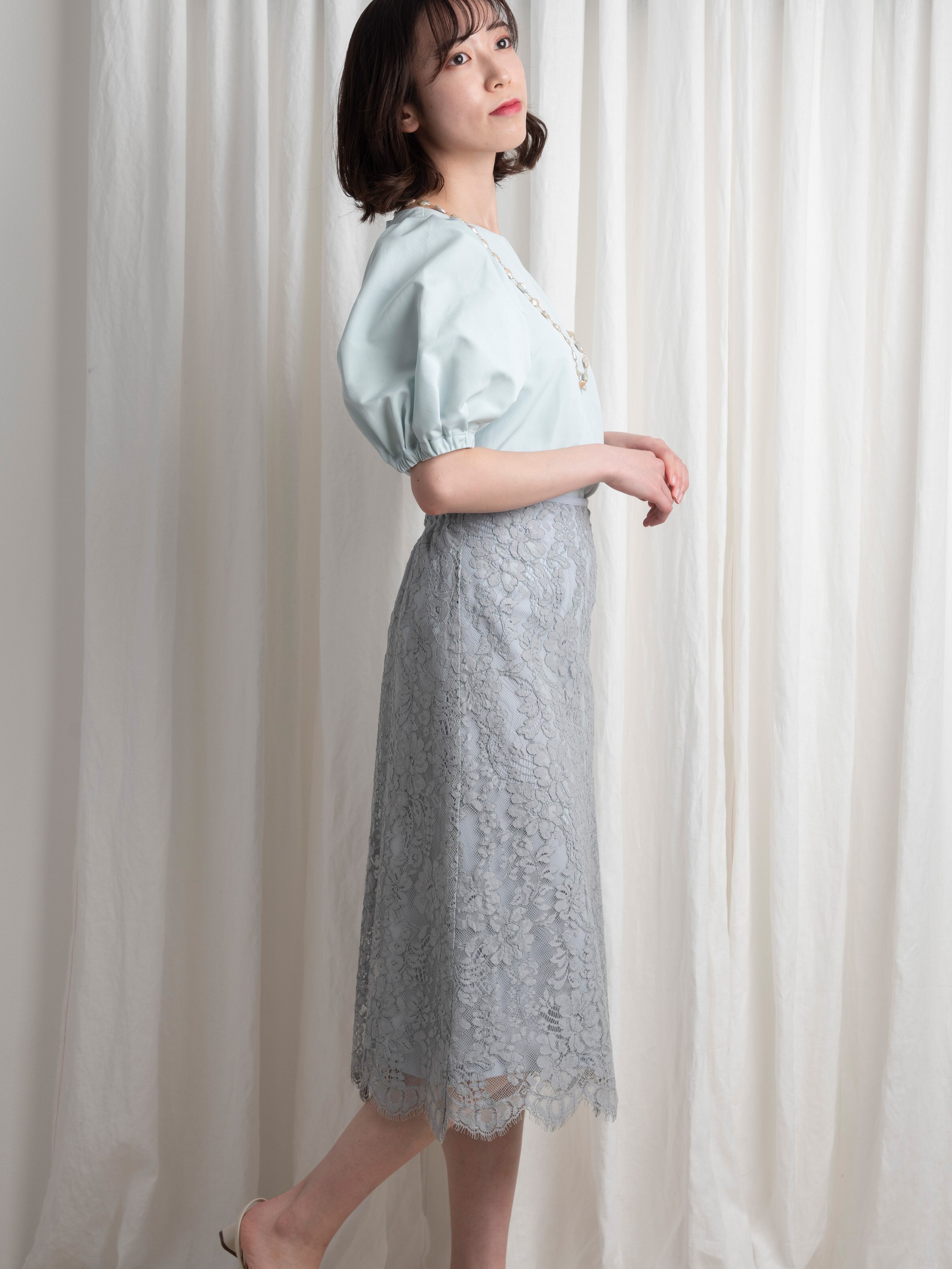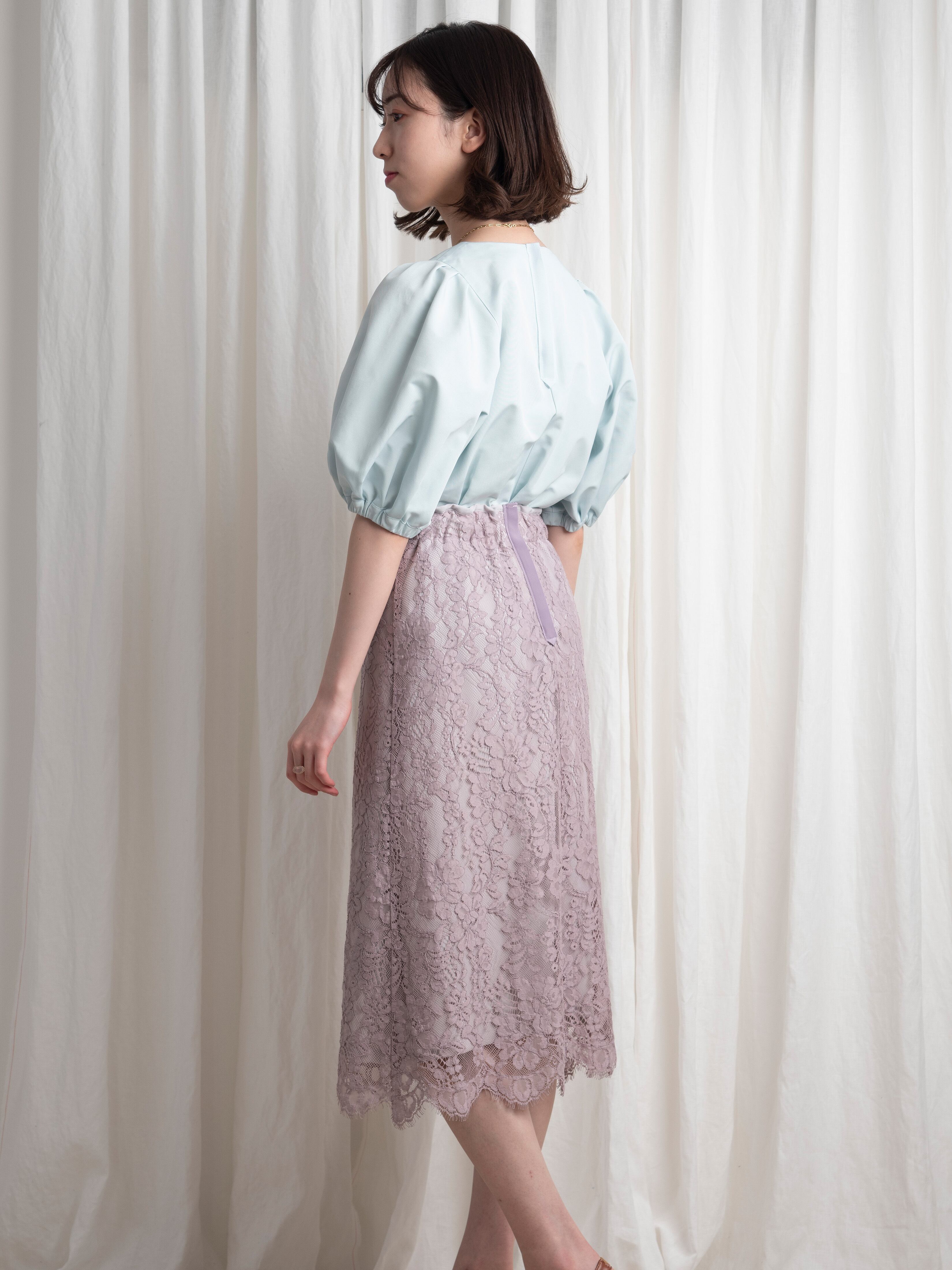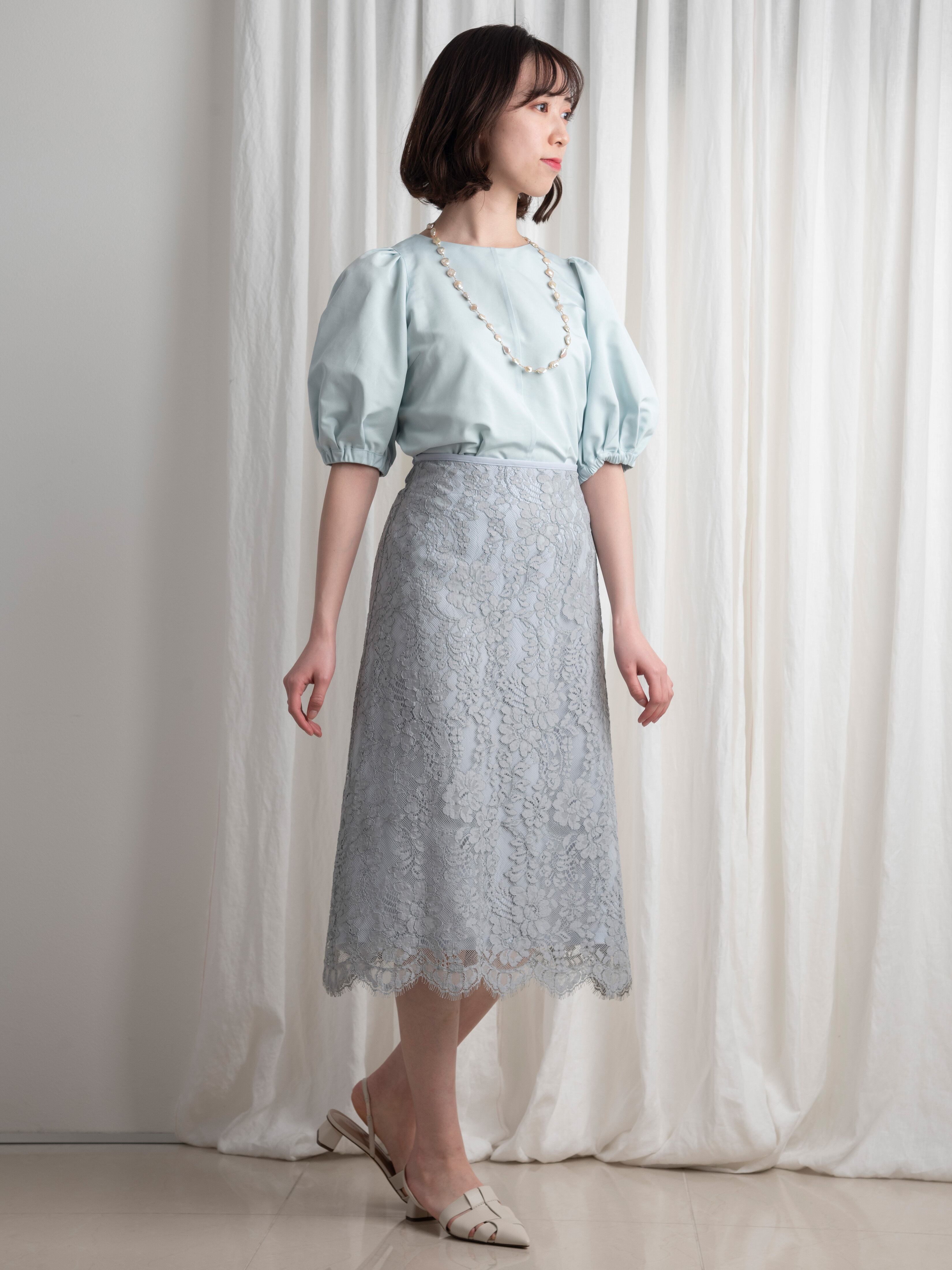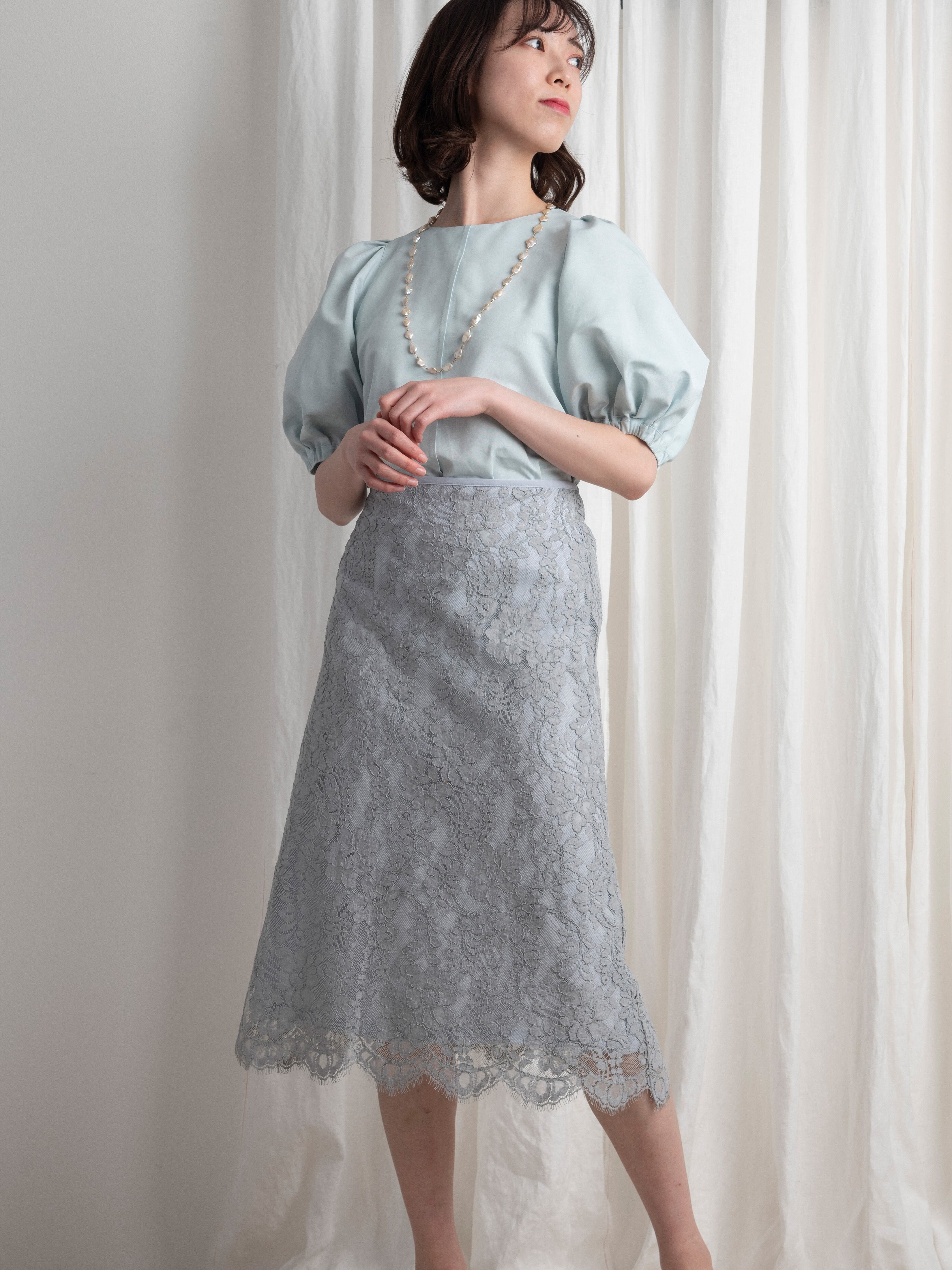 レースの繊細な美しさを楽しめるよう、こだわりのパターンで美しいシンプルなシルエットが完成しました。裏地は、レースの美しさが浮き立つよう、微妙に異なる同系色のジョーゼットを合わせました。どのようなアイテムも上品にまとめ上げるスカートです。