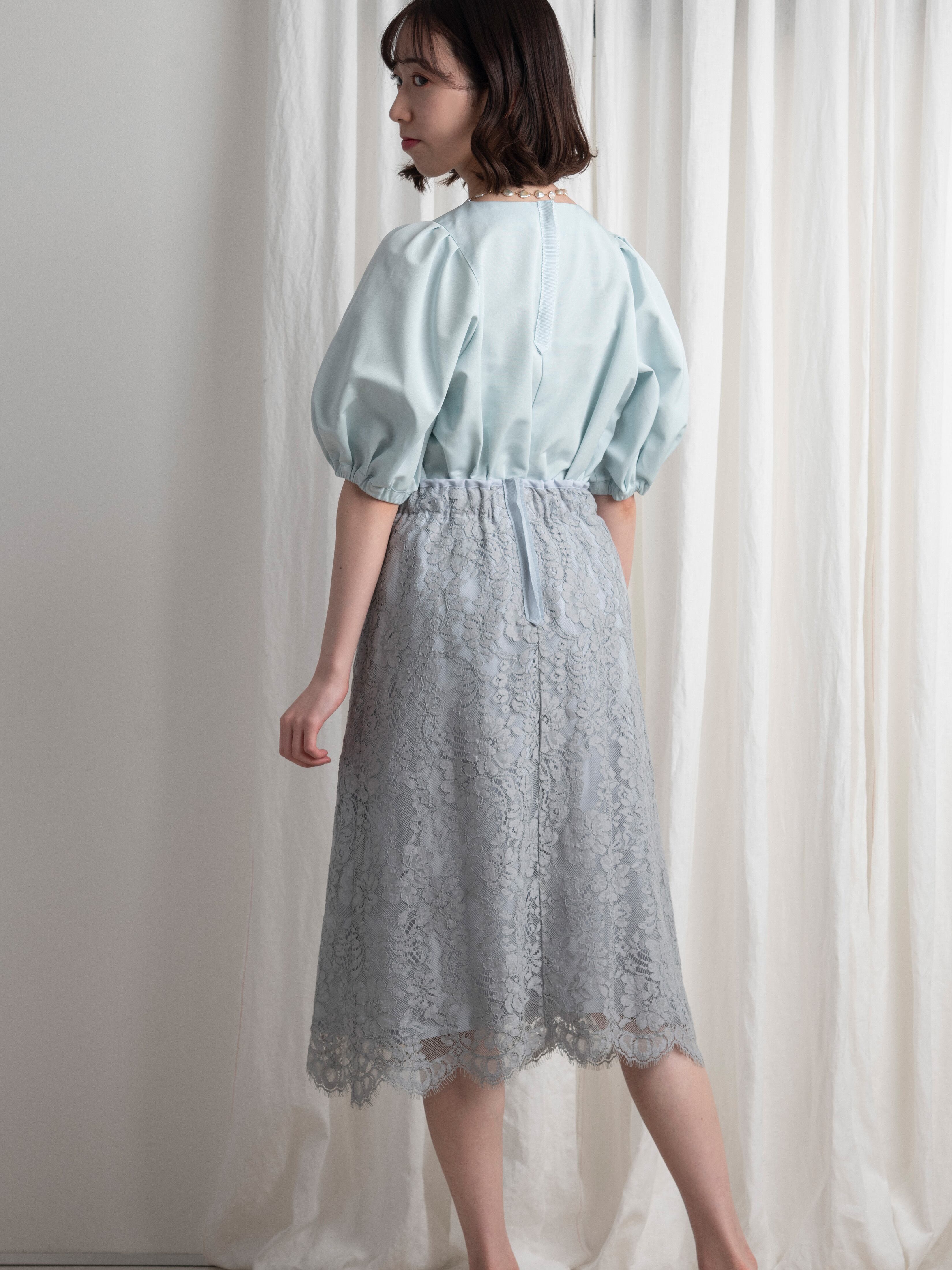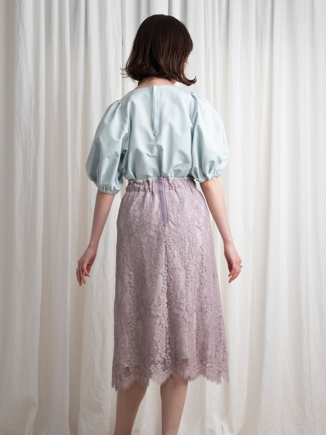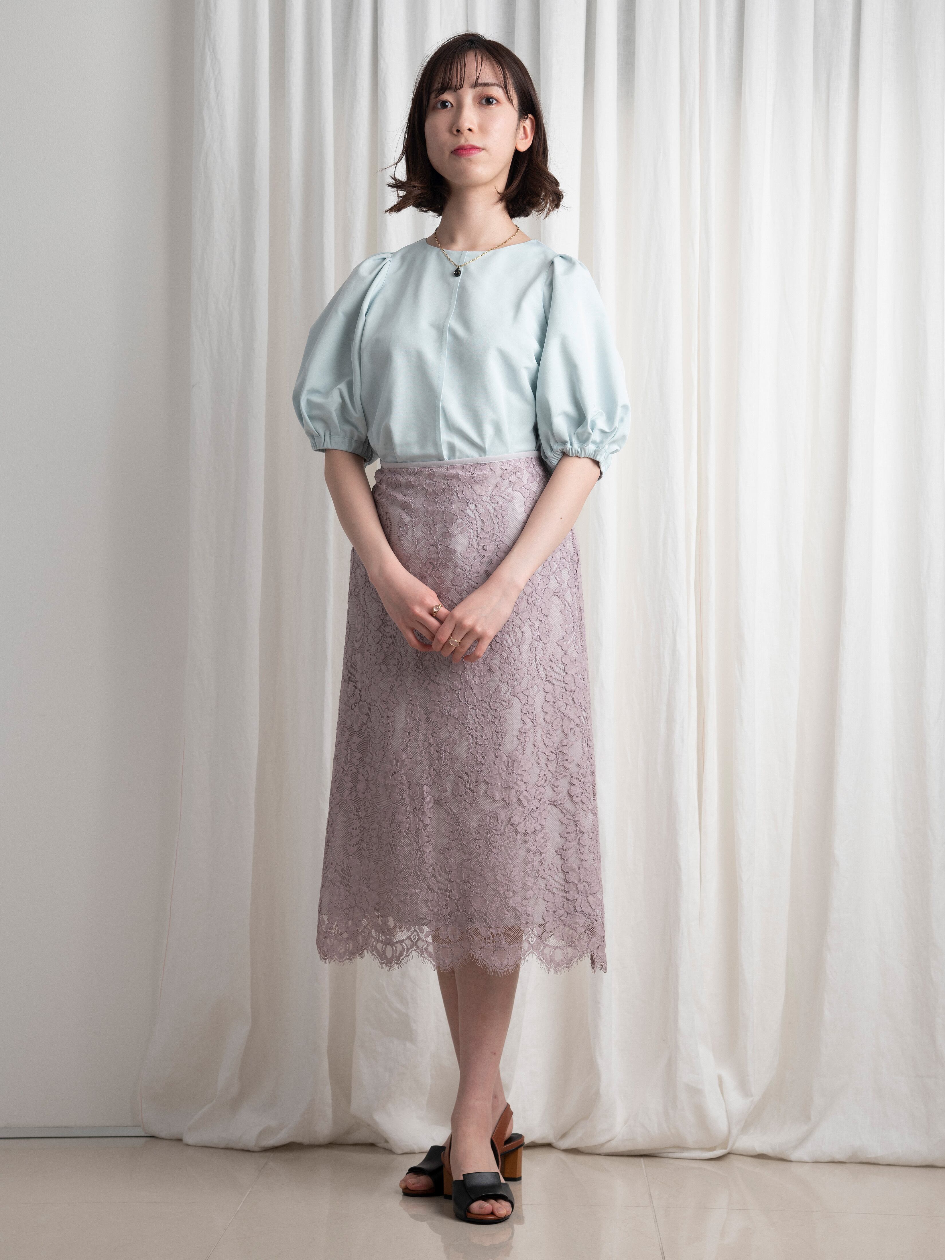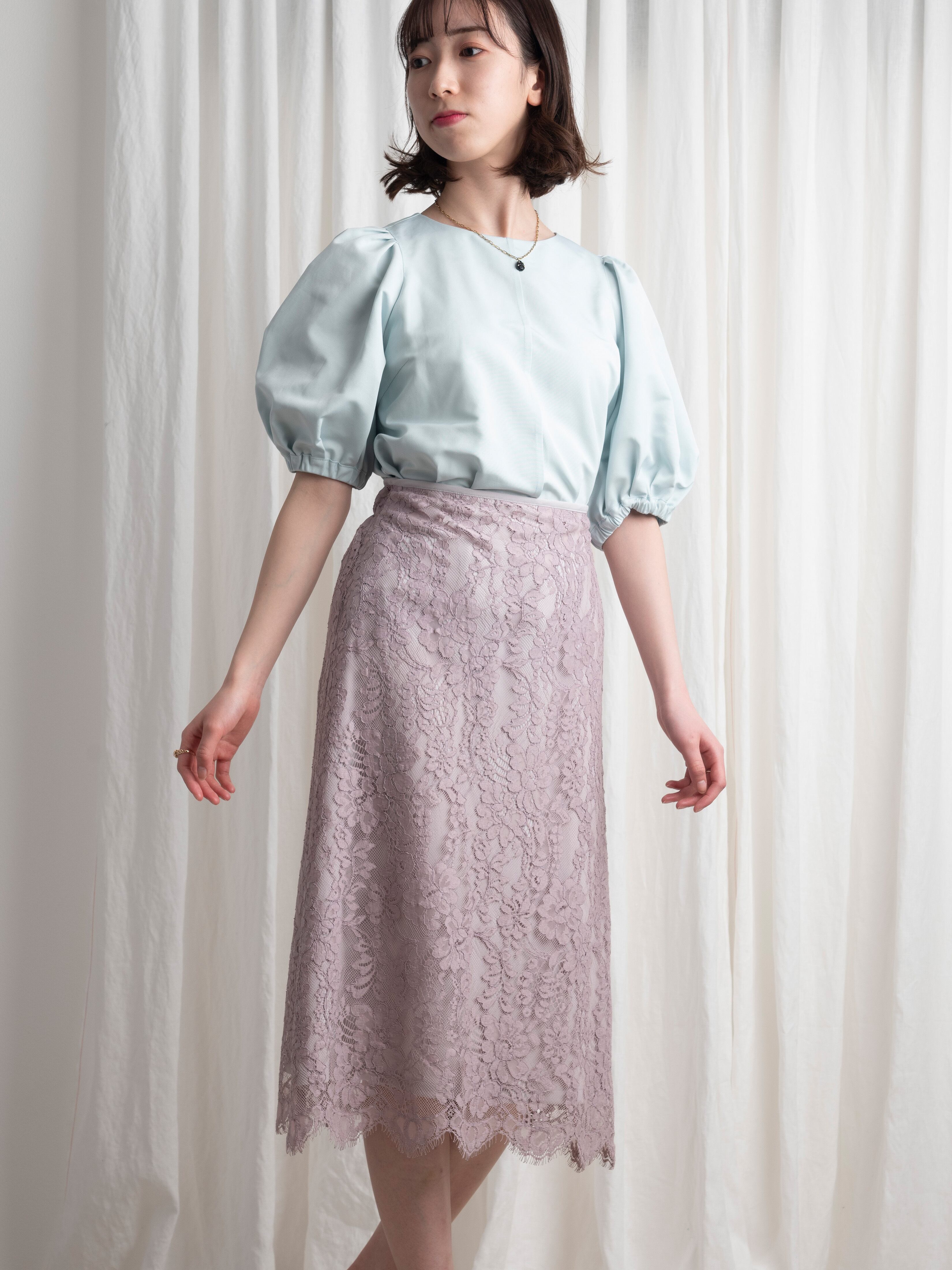 レースの繊細な美しさを楽しめるよう、こだわりのパターンで美しいシンプルなシルエットが完成しました。裏地は、レースの美しさが浮き立つよう、微妙に異なる同系色のジョーゼットを合わせました。どのようなアイテムも上品にまとめ上げるスカートです。
