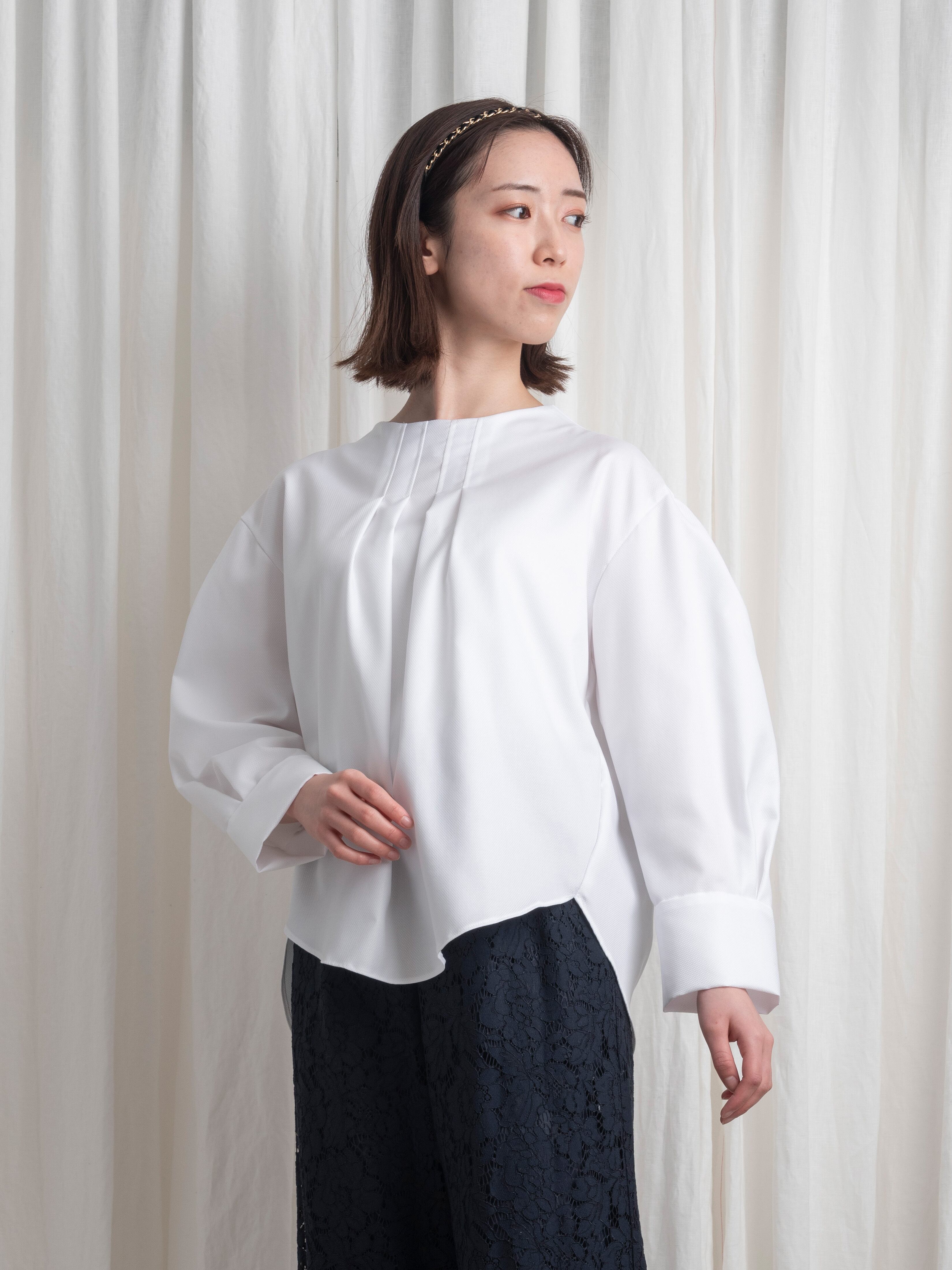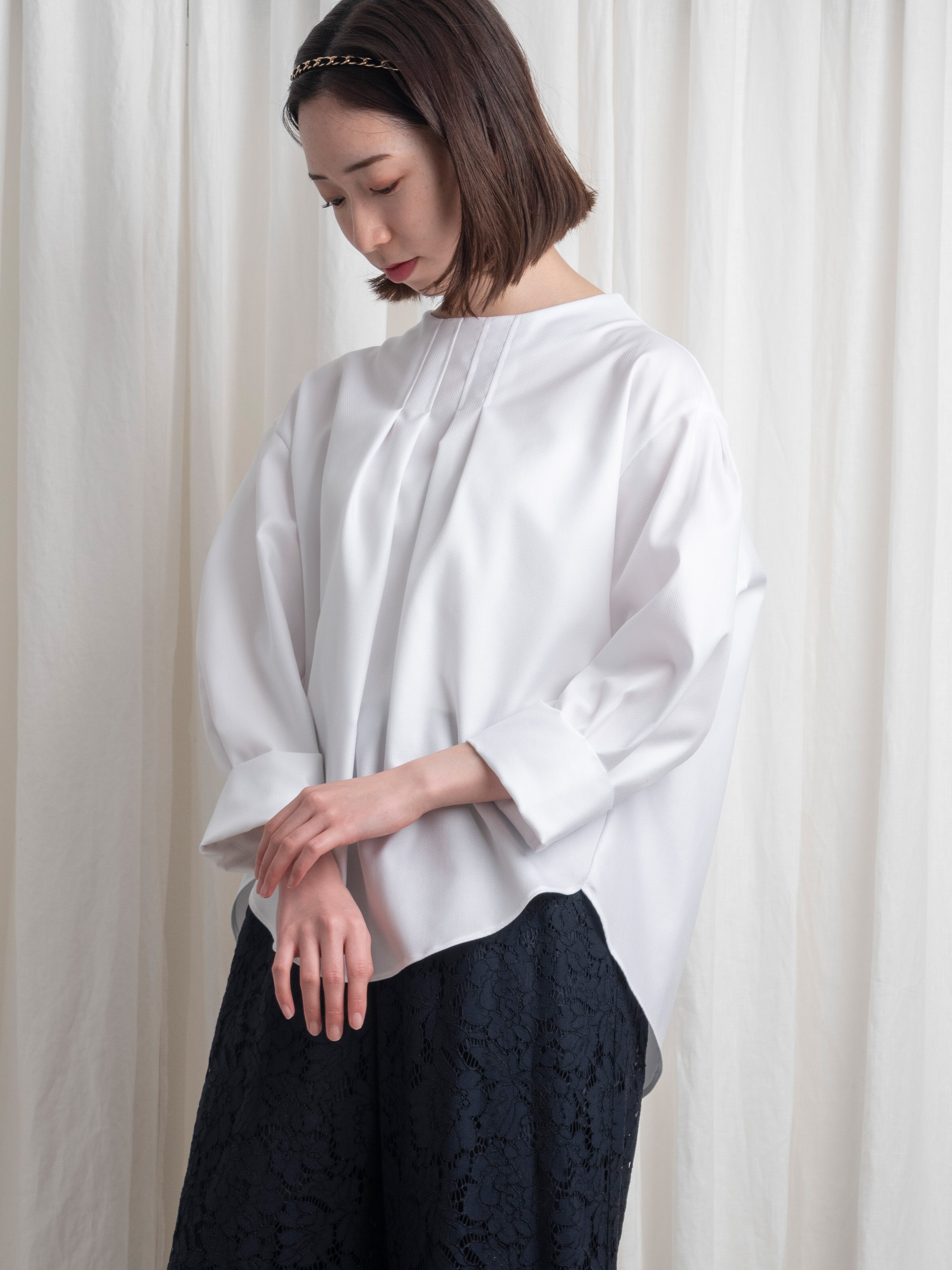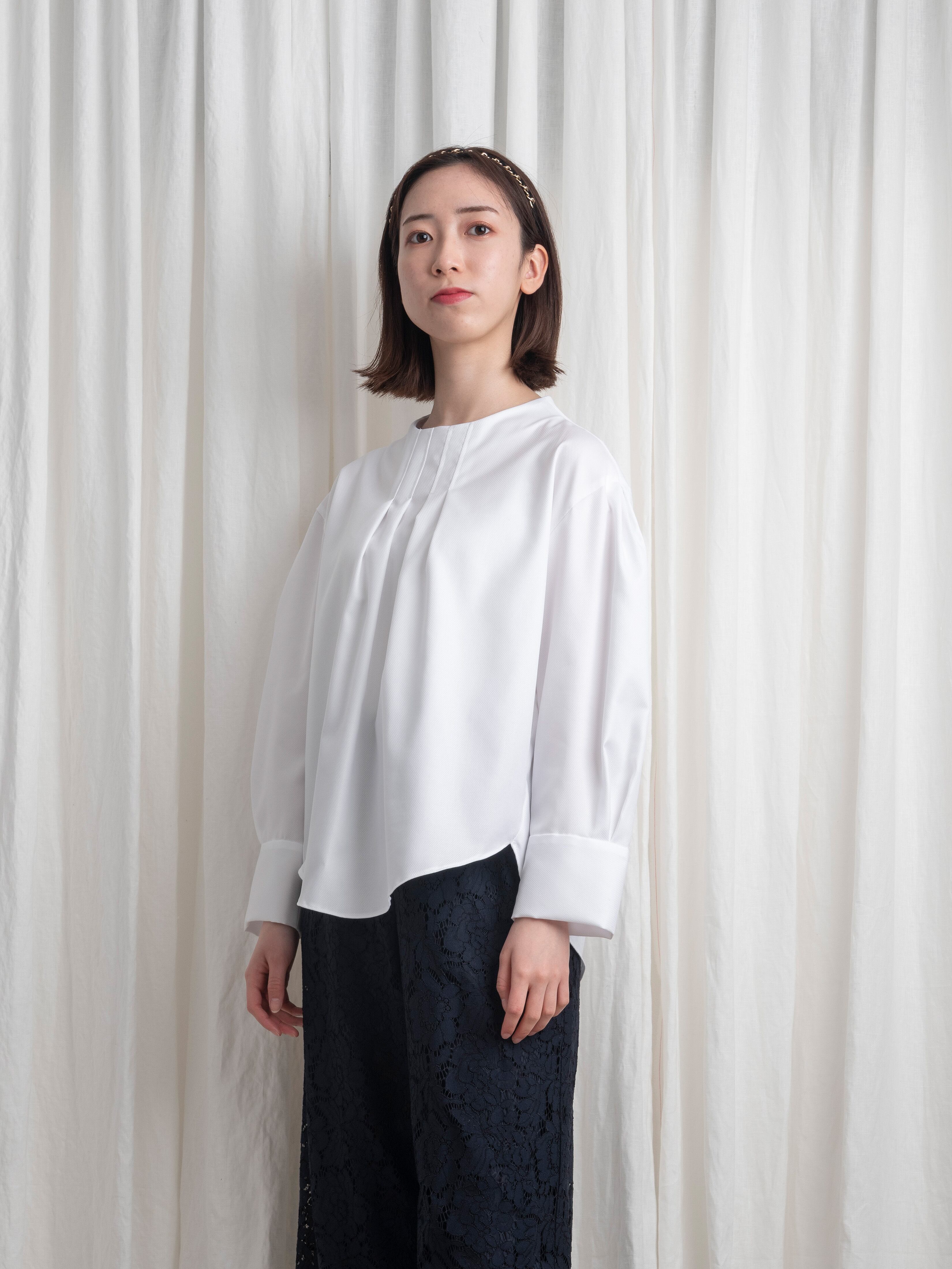 襟元は、少し立ち上がりながら首元に遊びを残したボトルネックで、スッキリとした首筋のラインを強調。見頃の前後には、タックを寄せて印影を付けることで、縦のラインを印象づけます。袖山にはタックでボリューム感をプラス。袖口は、カフスのようなデザインで、折り上げて袖の長さを調節できます。