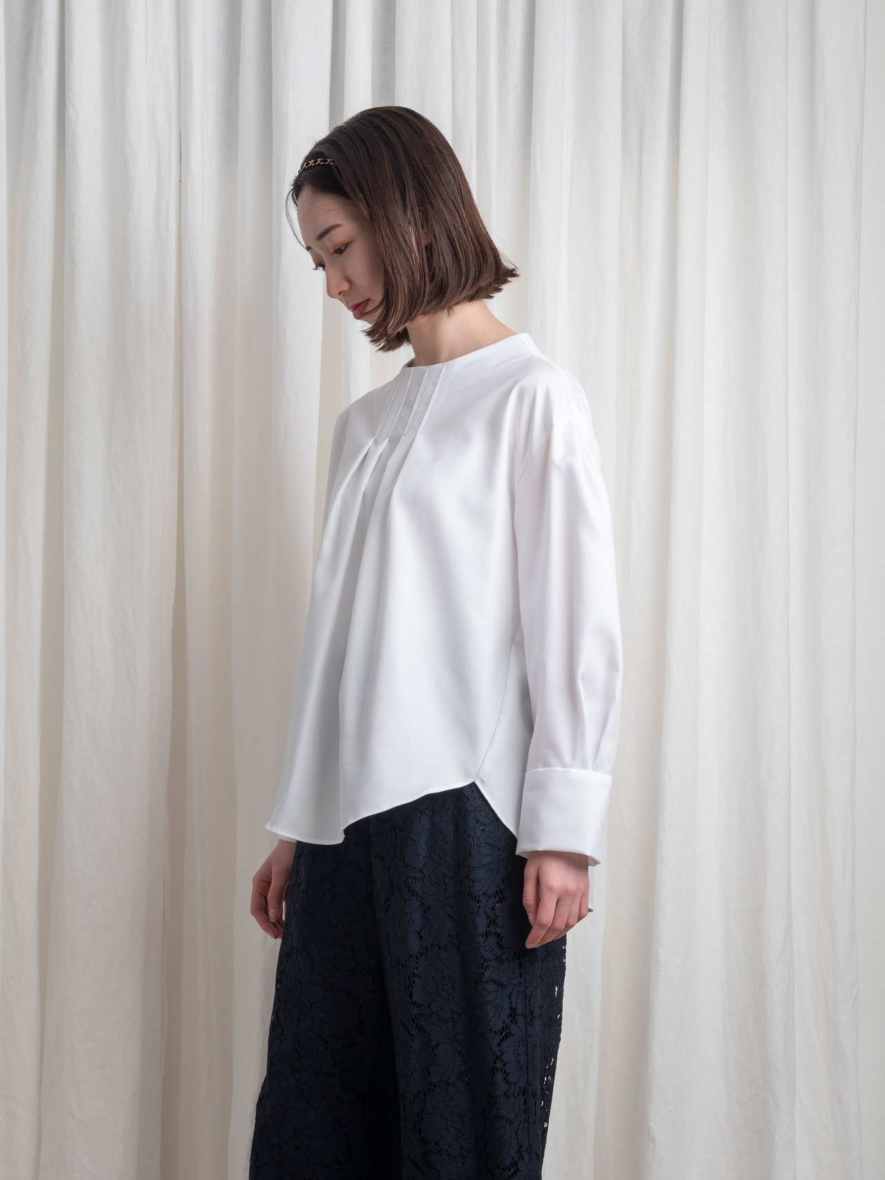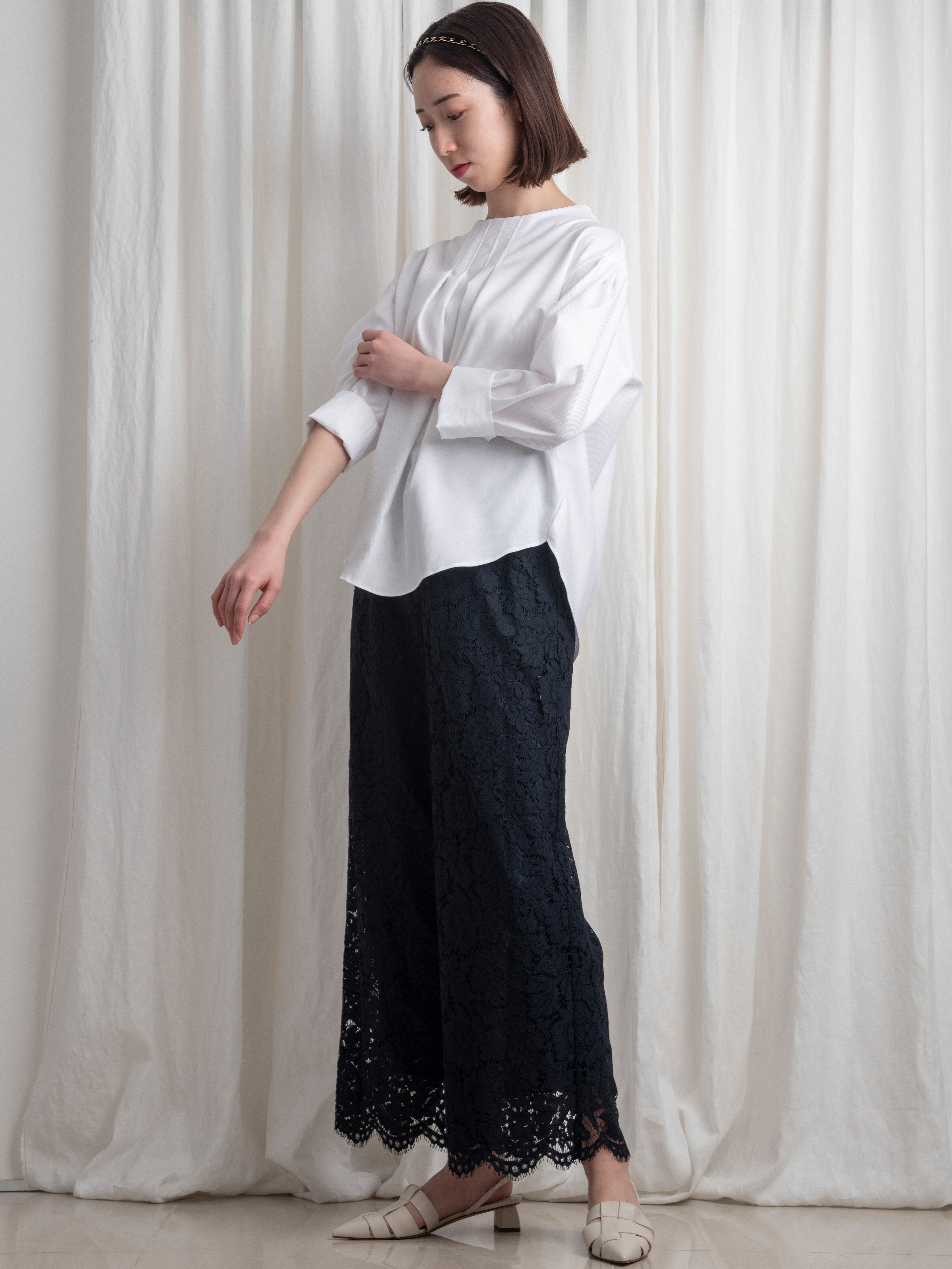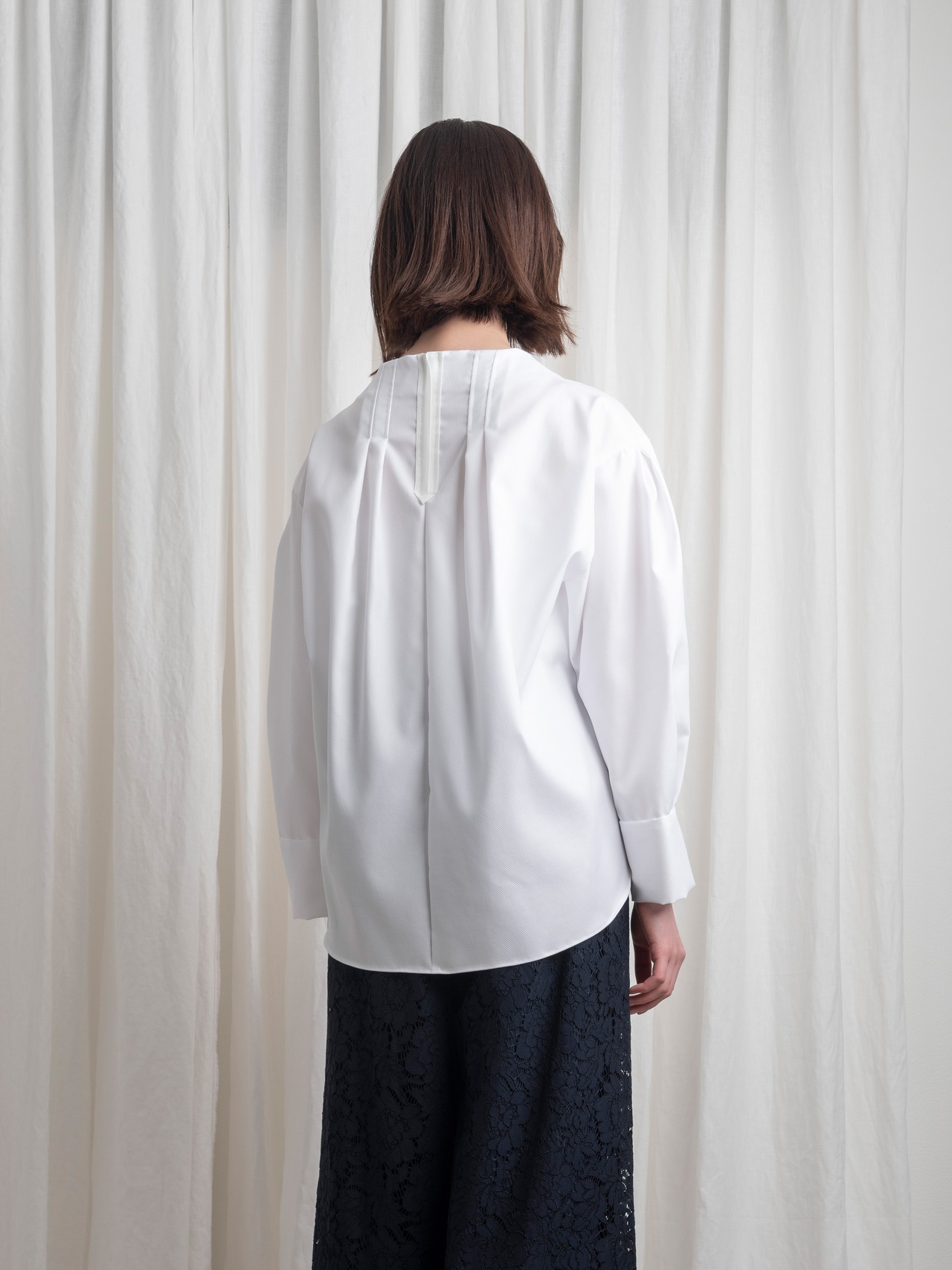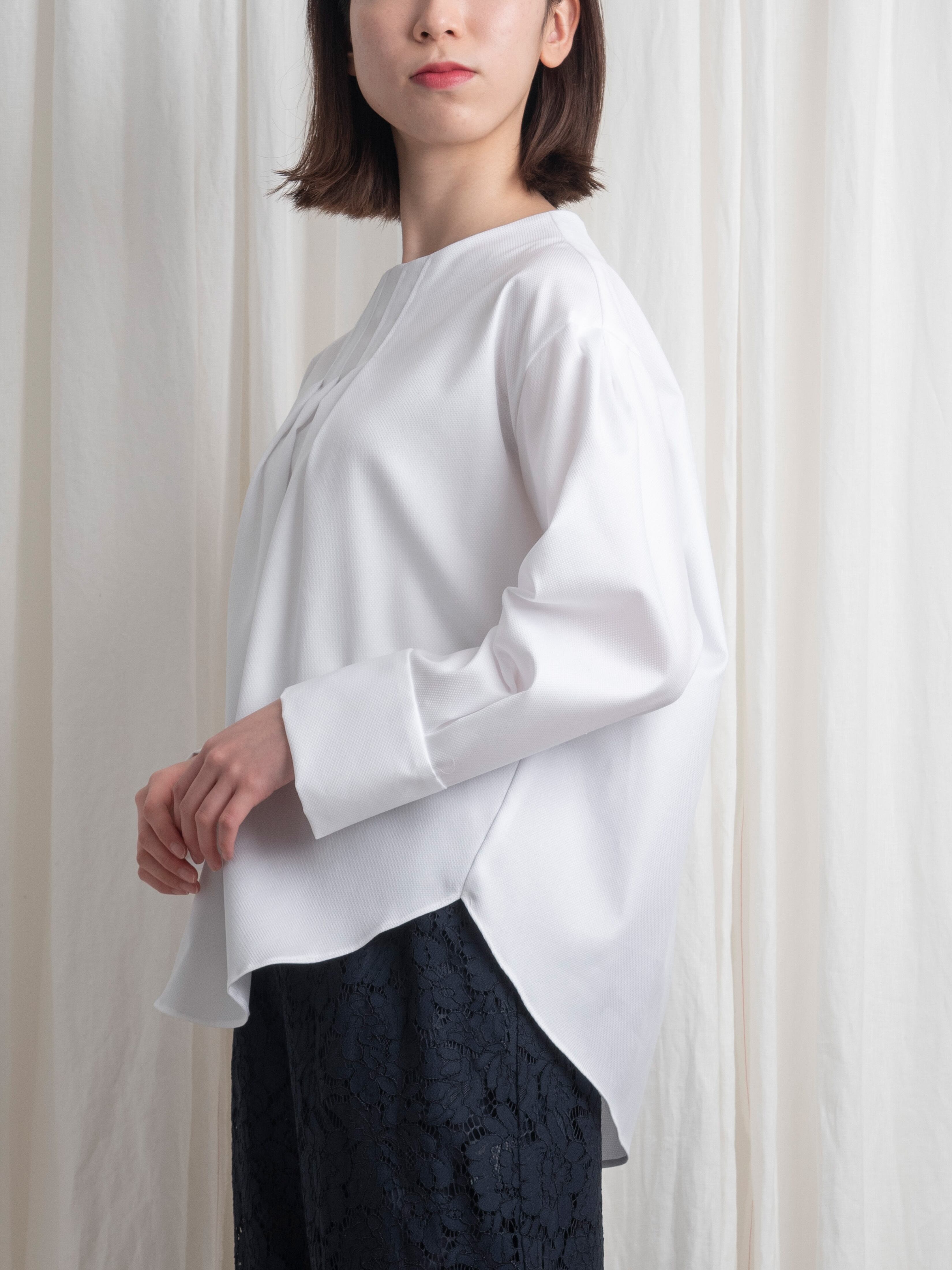 襟元は、少し立ち上がりながら首元に遊びを残したボトルネックで、スッキリとした首筋のラインを強調。見頃の前後には、タックを寄せて印影を付けることで、縦のラインを印象づけます。袖山にはタックでボリューム感をプラス。袖口は、カフスのようなデザインで、折り上げて袖の長さを調節できます。
