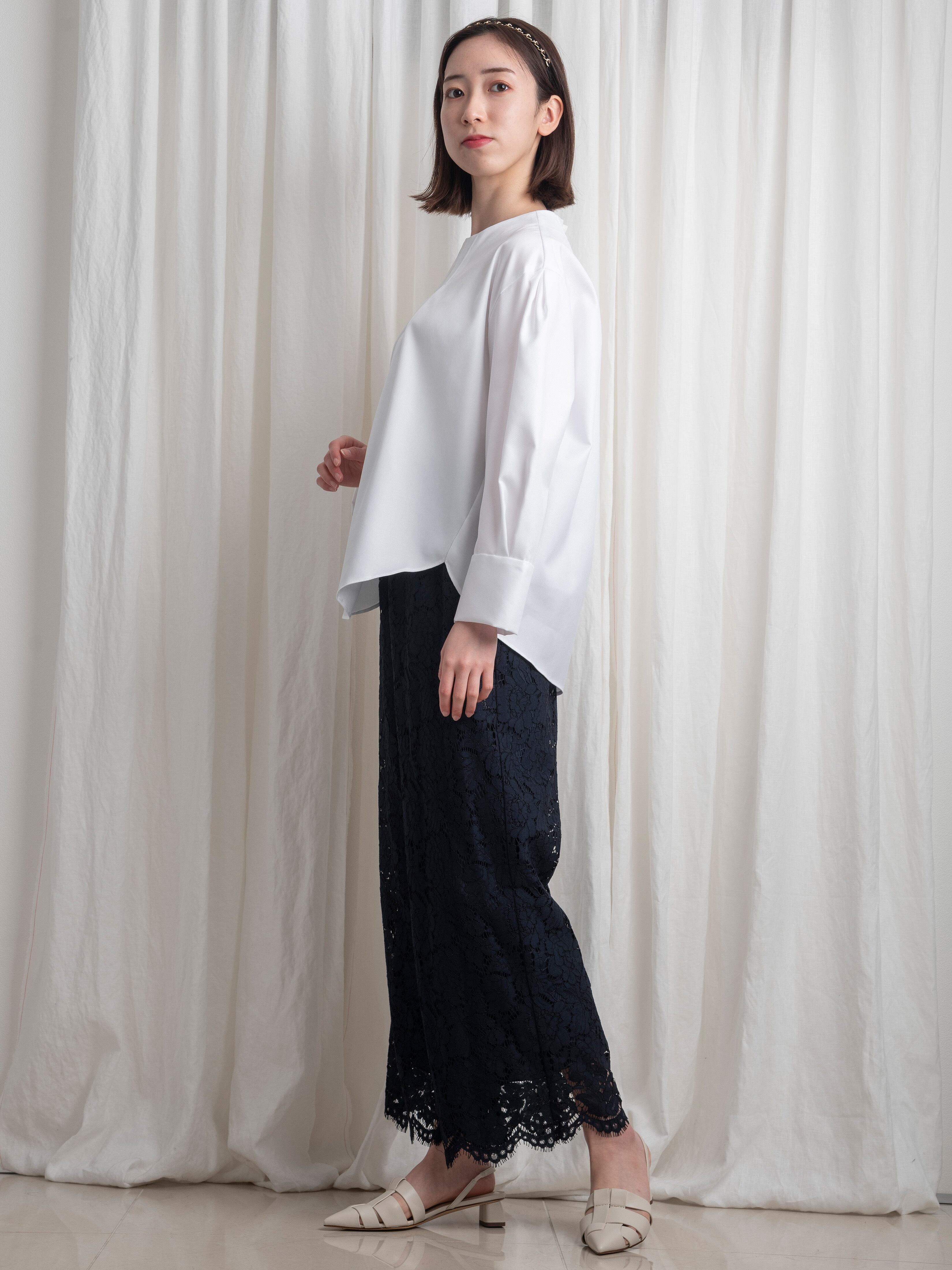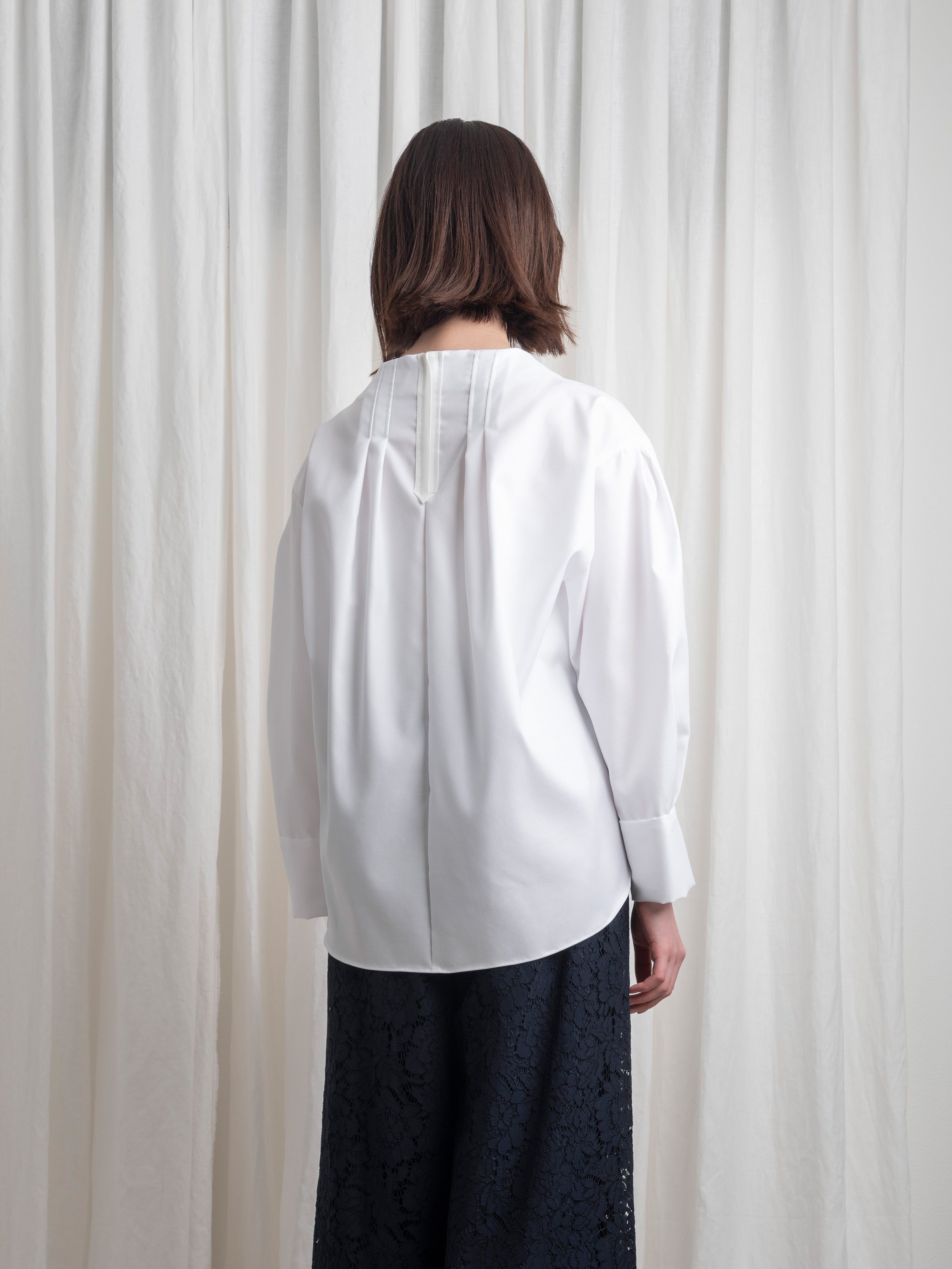 美しい織り地の魅力を引き立てるよう、カジュアルな印象のノーカラーブラウスを仕立てました。シルエットやパターンの善し悪しが強調されるシンプルなデザインだからこそ、細部にまでこだわりました。裾は後ろを長めに取っているため、どの角度から見ても美しいラインを楽しめます。