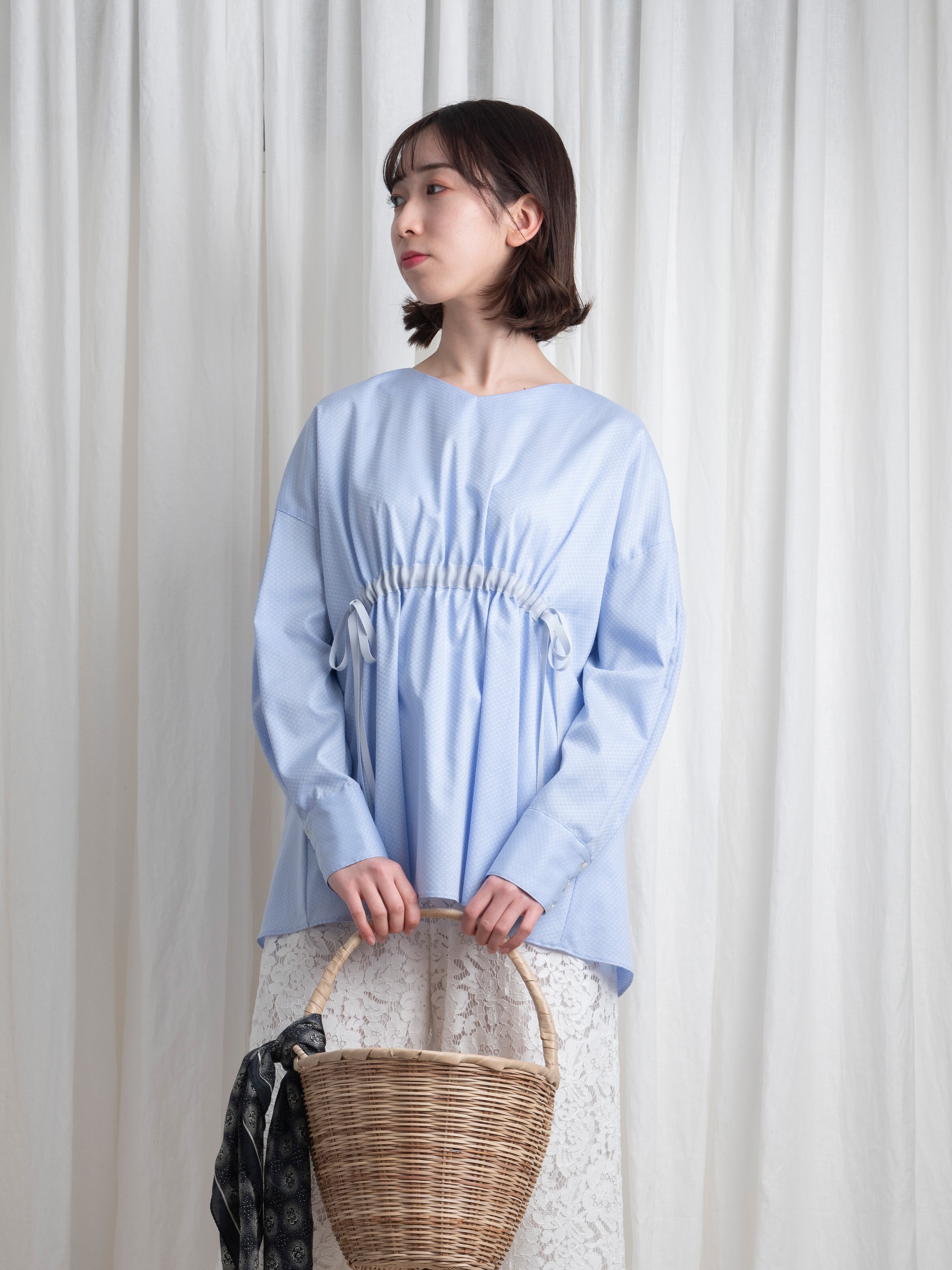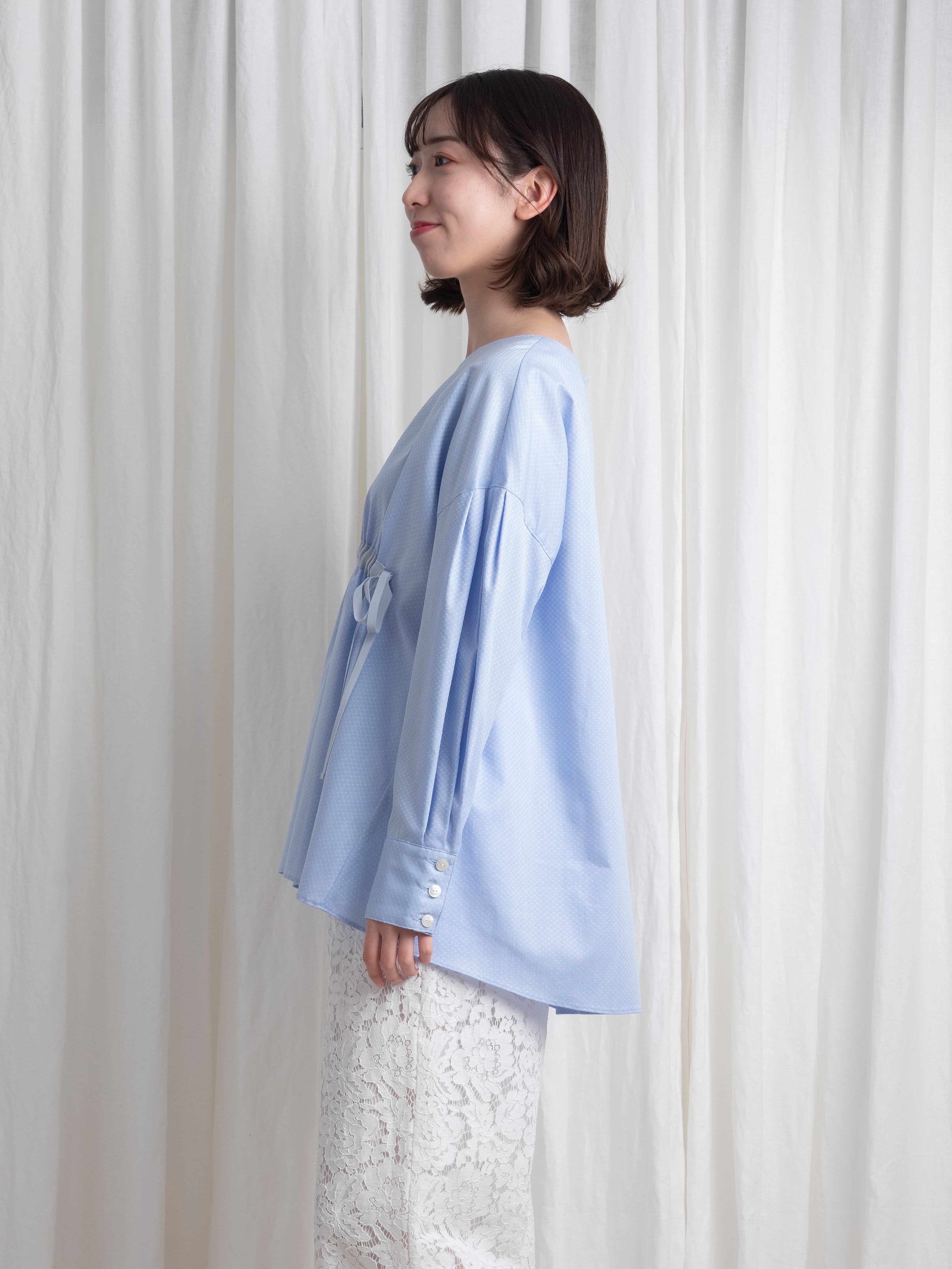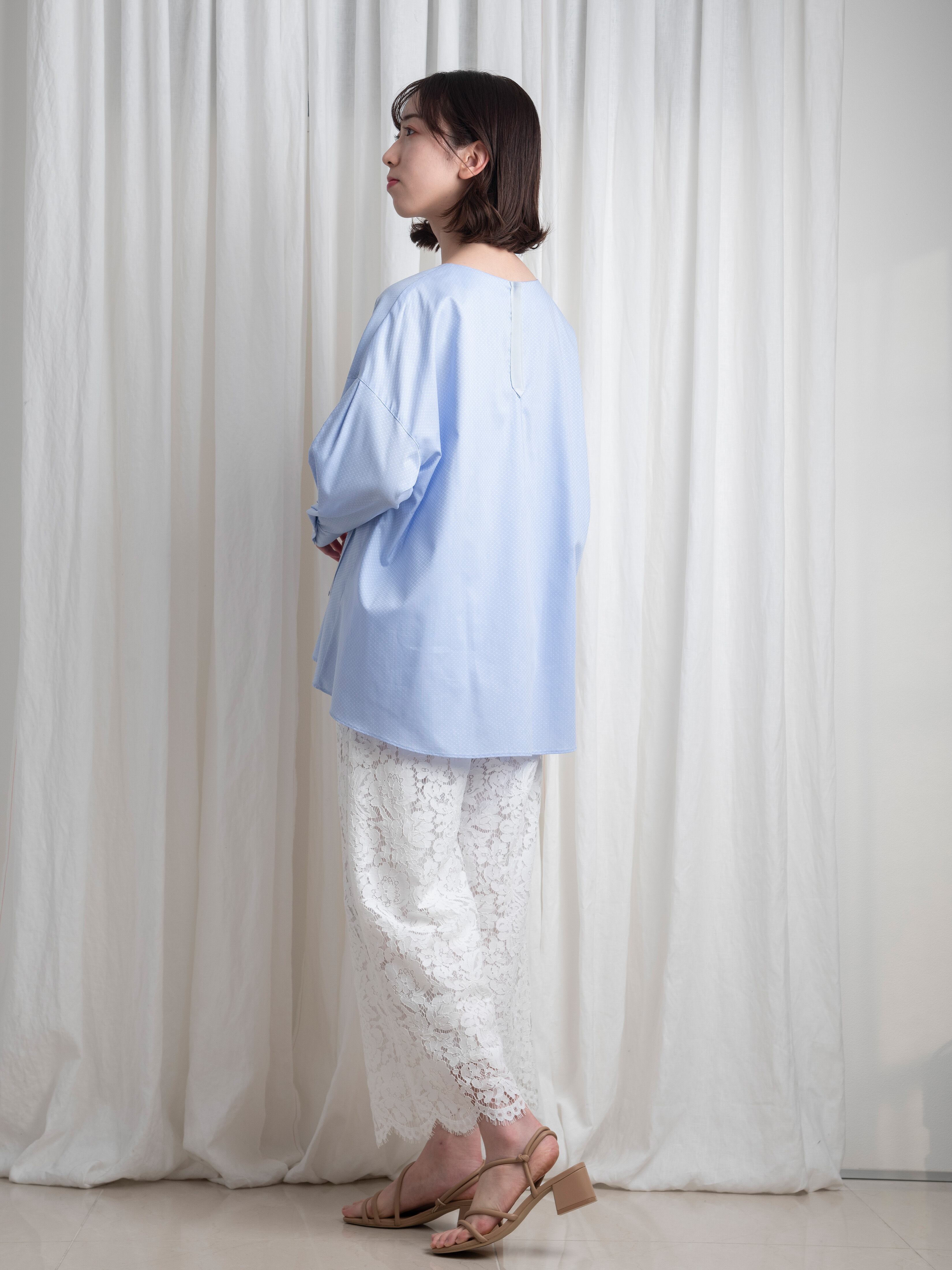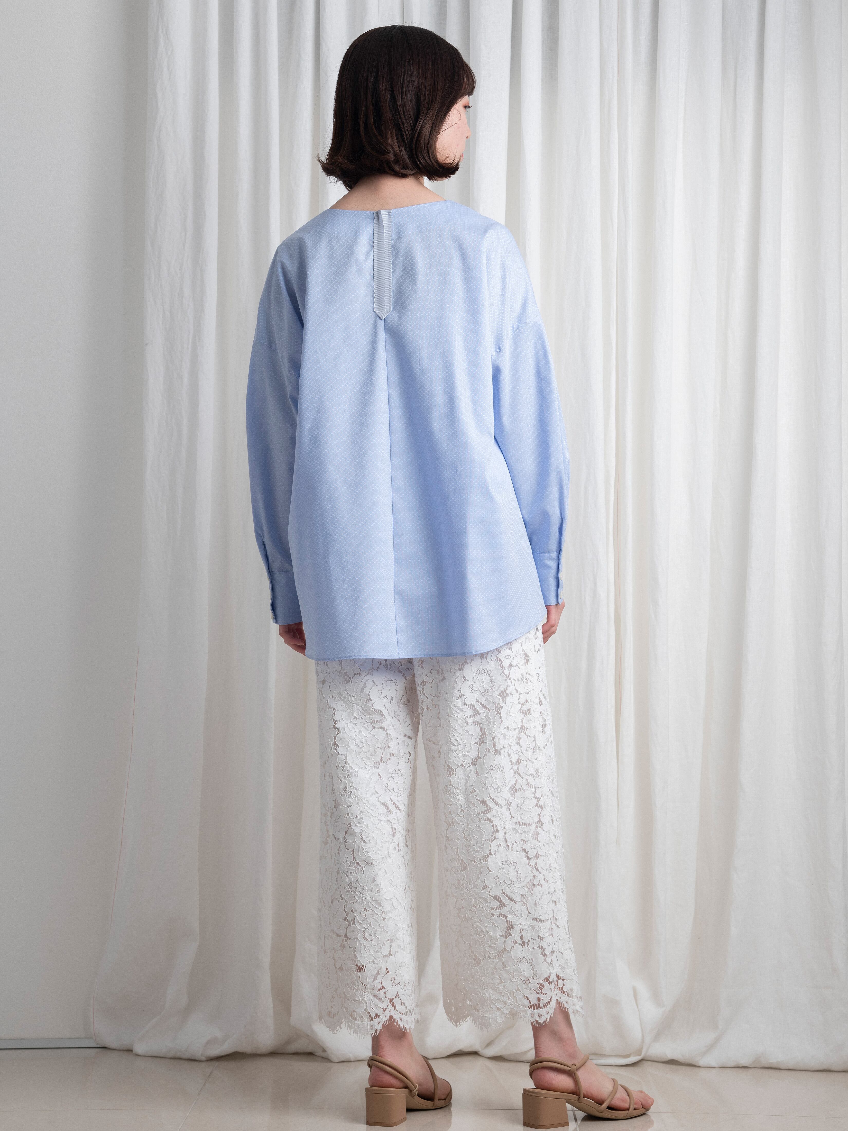 アクアブルーが美しいドビー織。そんな高級感を感じさせる複雑な織り方の光沢あるコットンで、オーバーサイズのブラウスを作りました。春から初夏まで、これ一枚でトレンドスタイルを表現できます。
