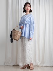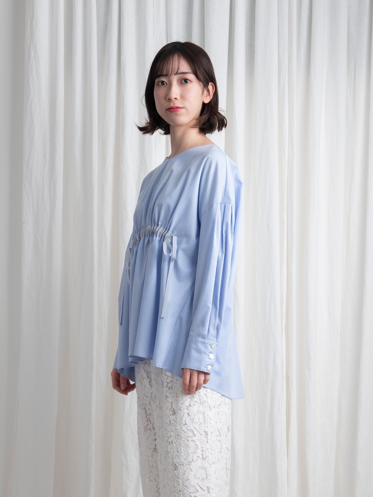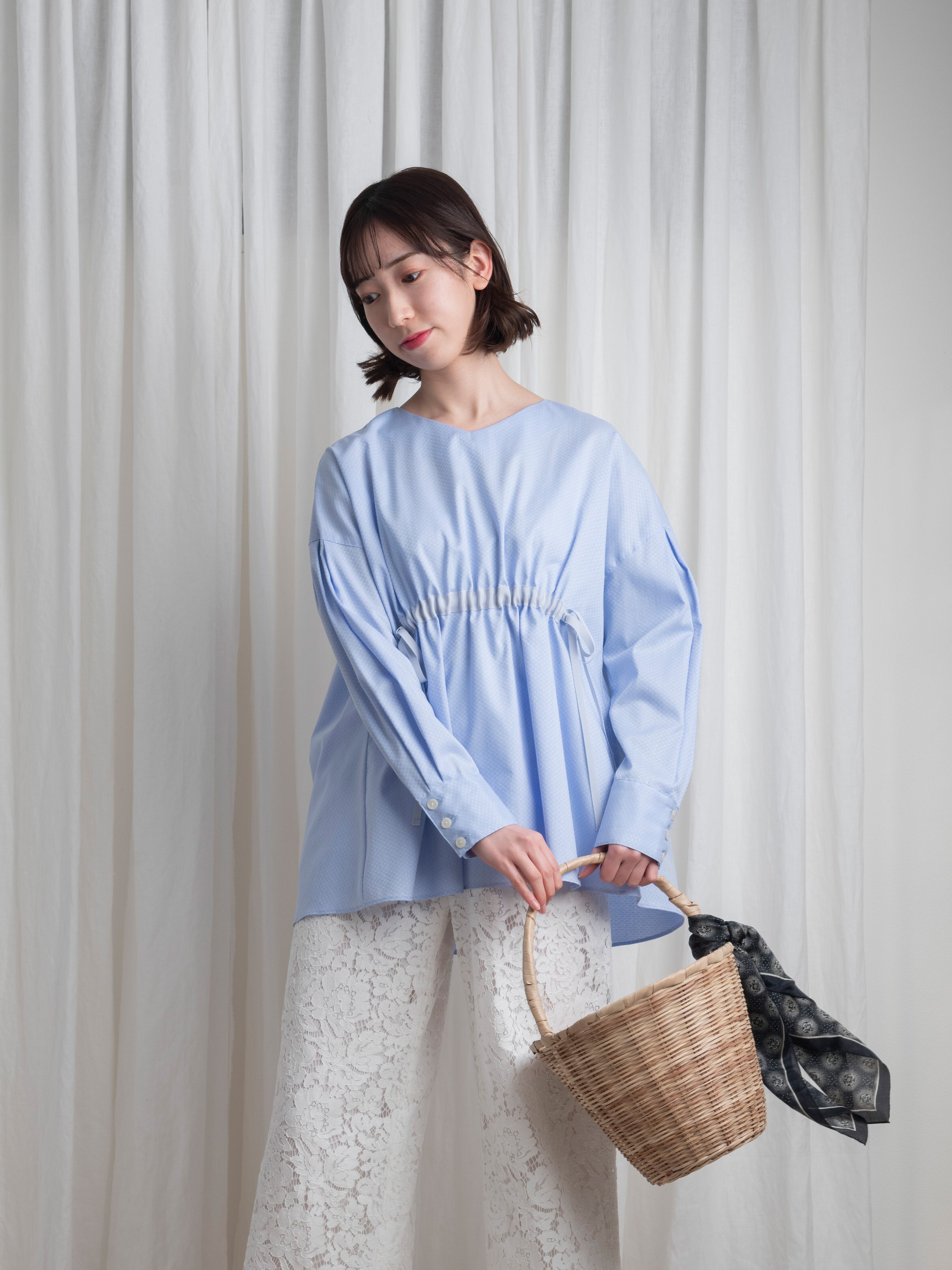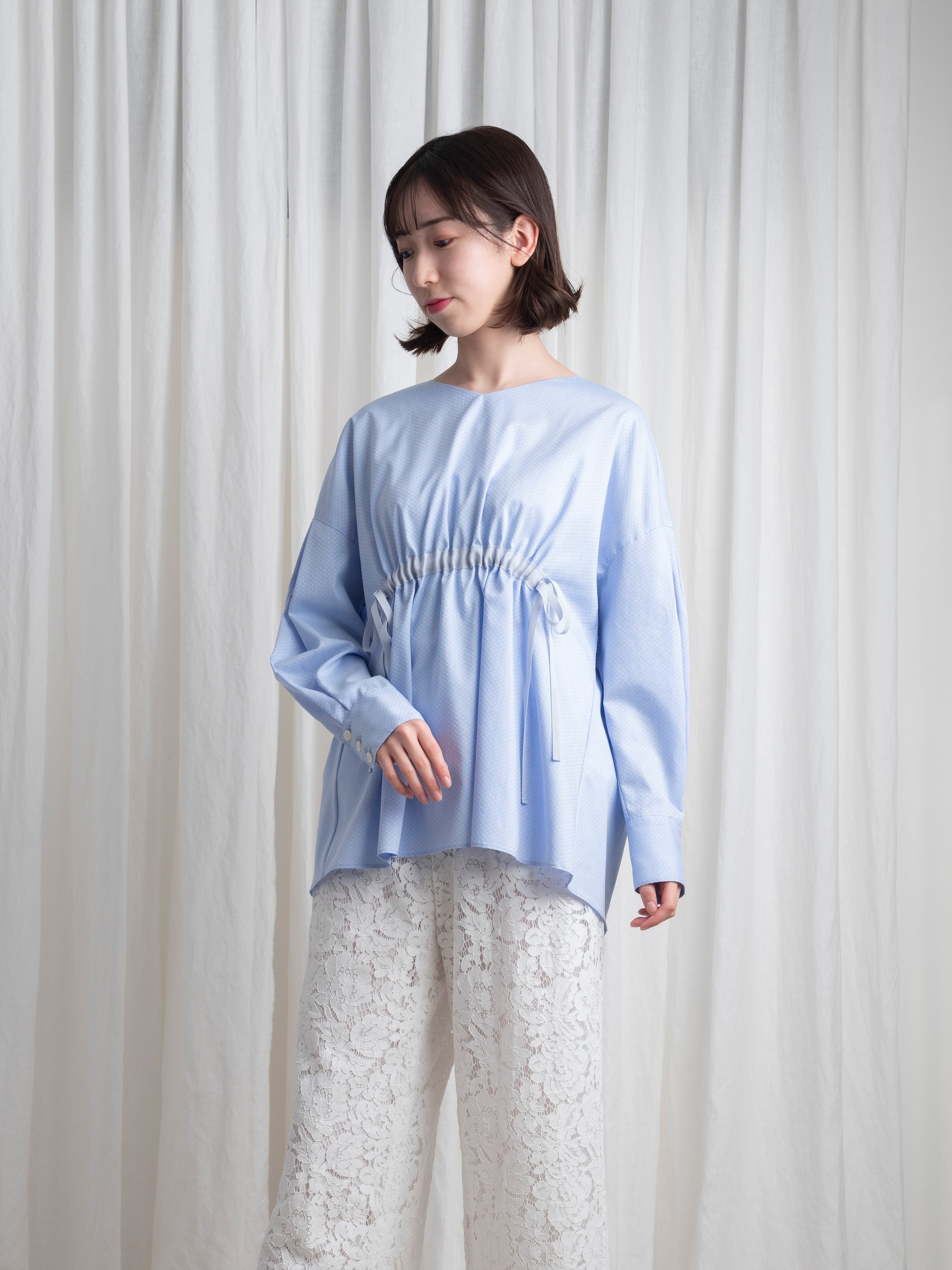 アクアブルーが美しいドビー織。そんな高級感を感じさせる複雑な織り方の光沢あるコットンで、オーバーサイズのブラウスを作りました。春から初夏まで、これ一枚でトレンドスタイルを表現できます。