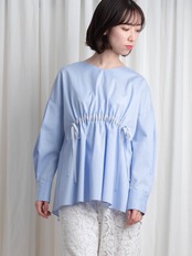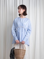 ゆったりとしたボックスシルエットの前身頃にシャーリングを施し、大人感のあるトレンドのシルエットが完成。バックスタイルは、肩から裾に広がるテントラインで動きをプラスしました。タックを寄せた袖、長めのカフスもポイント。エヌの得意技が光る美しいシルエットを楽しめます。